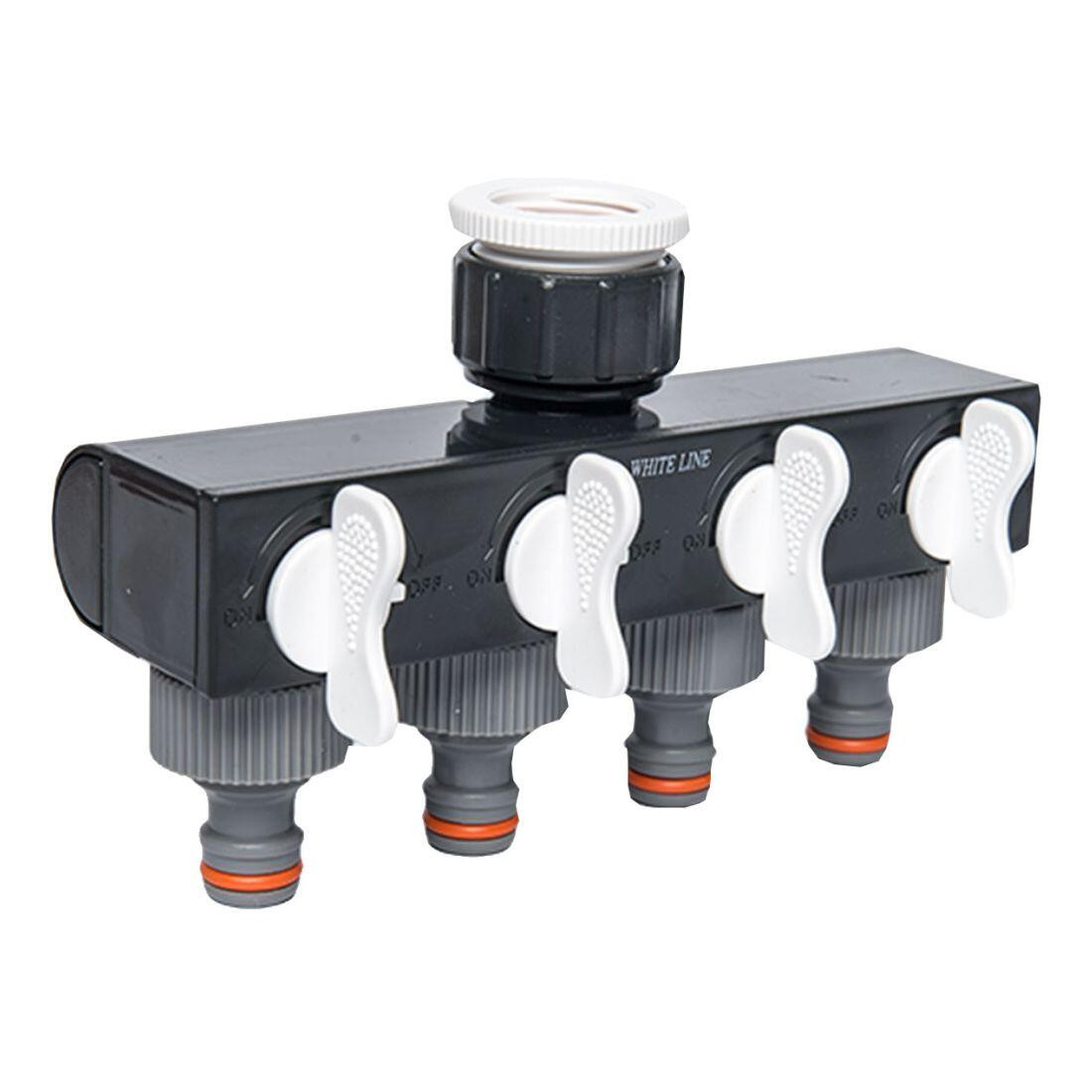 Adaptér na kohoutek - rozdělovač 4cestný WHITE LINE. - 4 nezávisle nastavitelné ventily pro 1" kohoutek s redukcí 3/4" - vyrobeno z odolného plastu - možno otevírat a uzavírat jednotlivé rozdělovače dle potřeby, pomocí plastové páčky Připojte si až 4 hadice na jeden kohoutek. Šířka přepravní: 11 cm Výška přepravní: 6 cm Hloubka přepravní: 18 cm Objem přepravní: 1,188 dm3 Hmotnost přepravní: 0,196 kg Distribuce: Typ doplňku: Listingový popis: Pozor křehké: