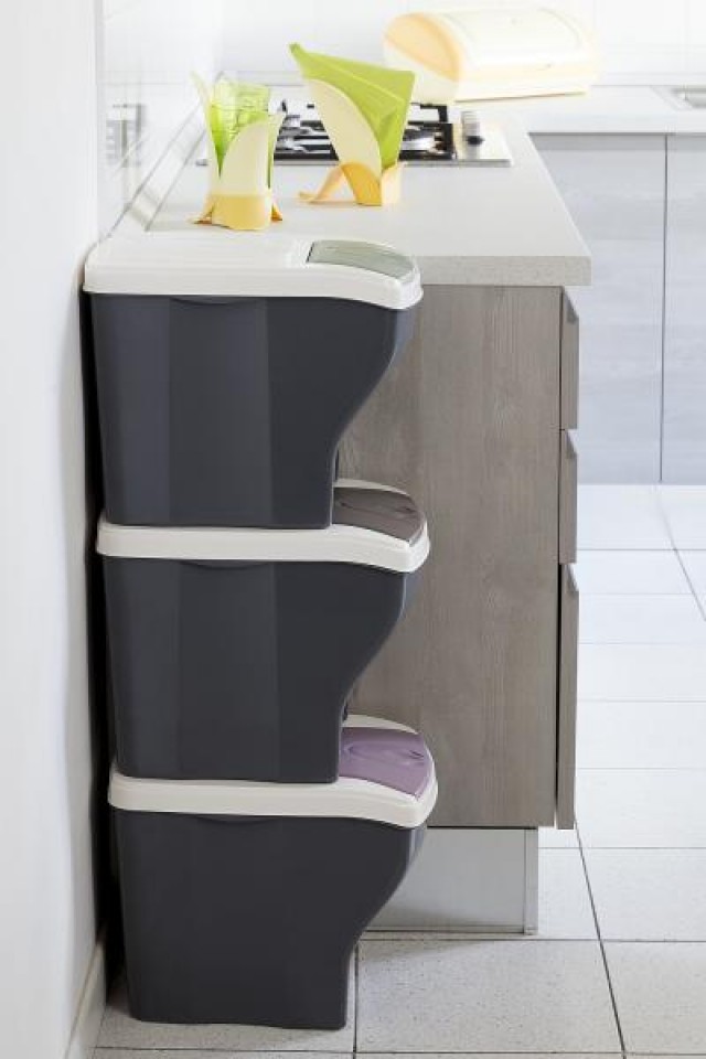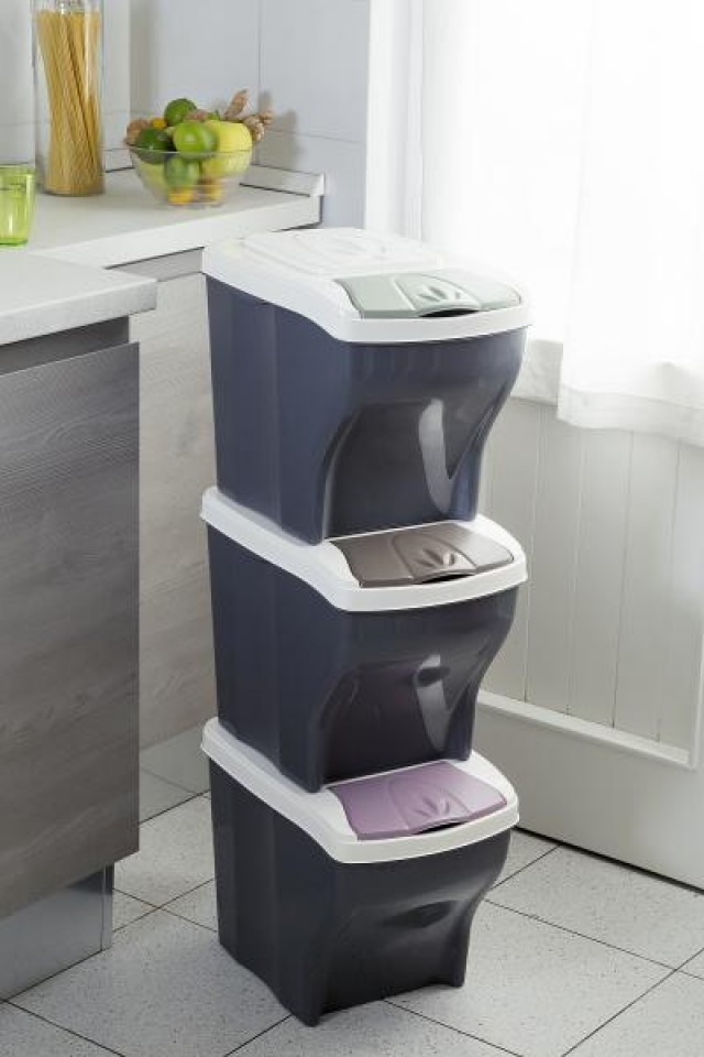 Stavebnicová sestava tří plastových košů o jednotlivém objemu 20 litrů v tmavém provedení.