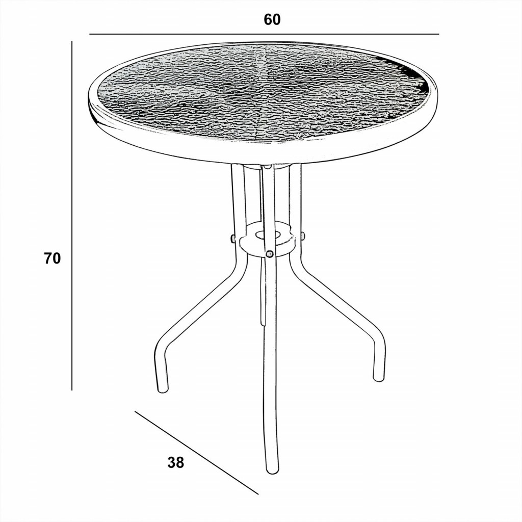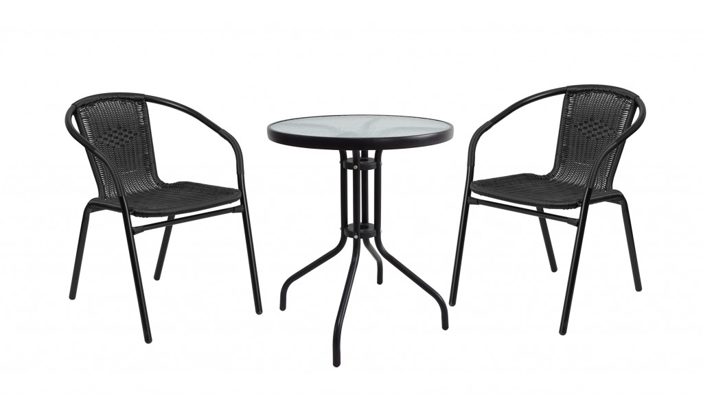 3dílný set nábytku z kovové konstrukce a polyratannu. 2 ks židlí a stůl se skleněnou výplní o průměru 60cm.