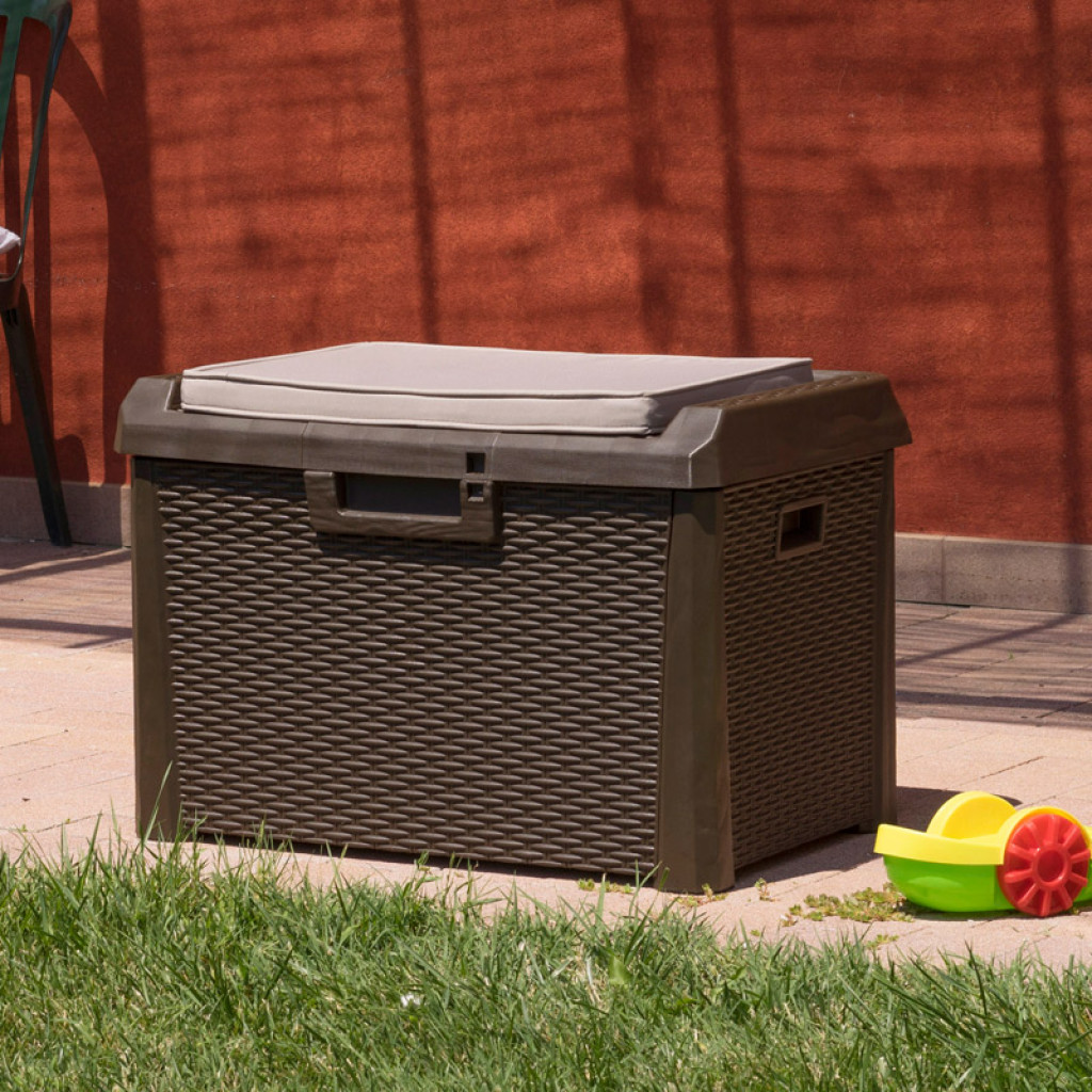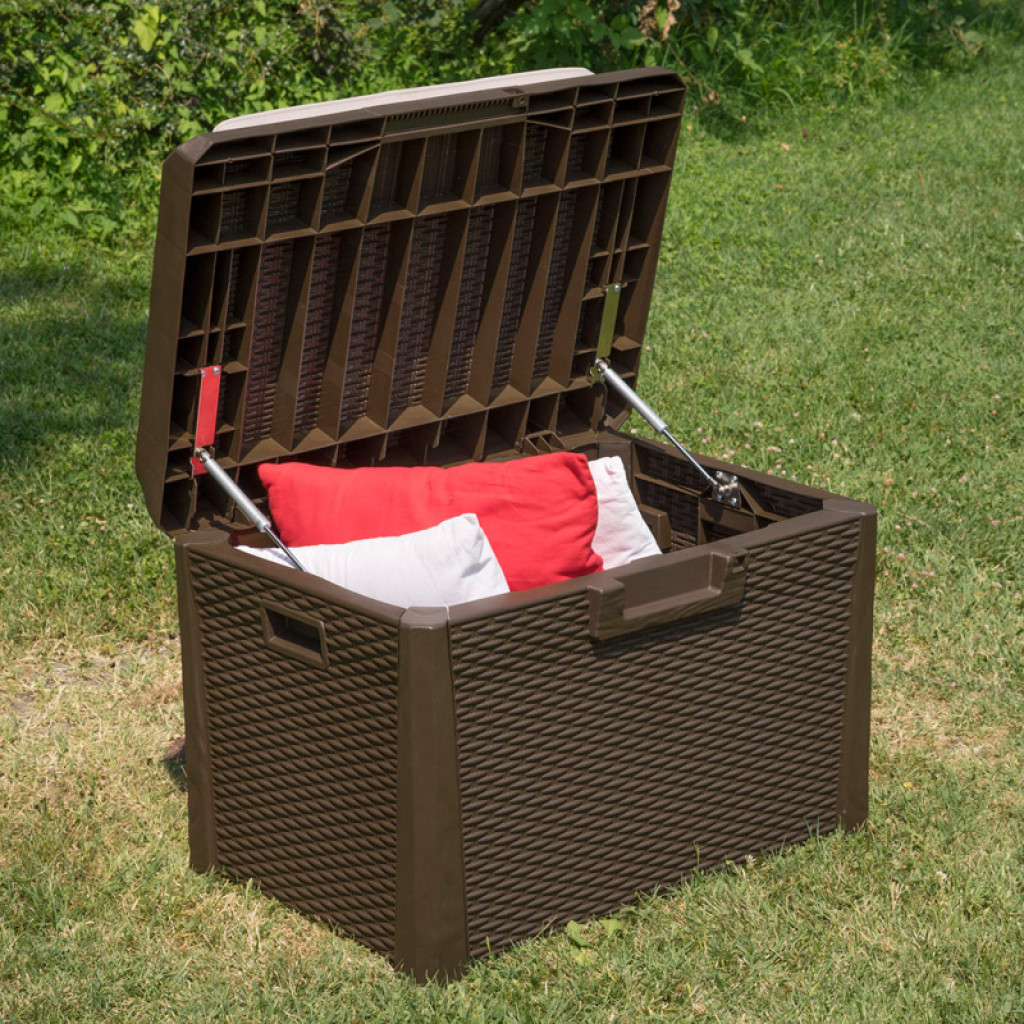 Zahradní úložný box, který je vhodný jak do vnitřních, tak venkovních prostor. Odhadovaný čas na sestavení boxu je 10 minut. Na sestavení boxu je potřeba základní nářadí. Box je vhodný pro sezení, pro 1 osobu. Box obsahuje pneumatický píst pro asistované otevírání a zavírání. Box obsahuje i podsedák. Možnost umístit zámek.