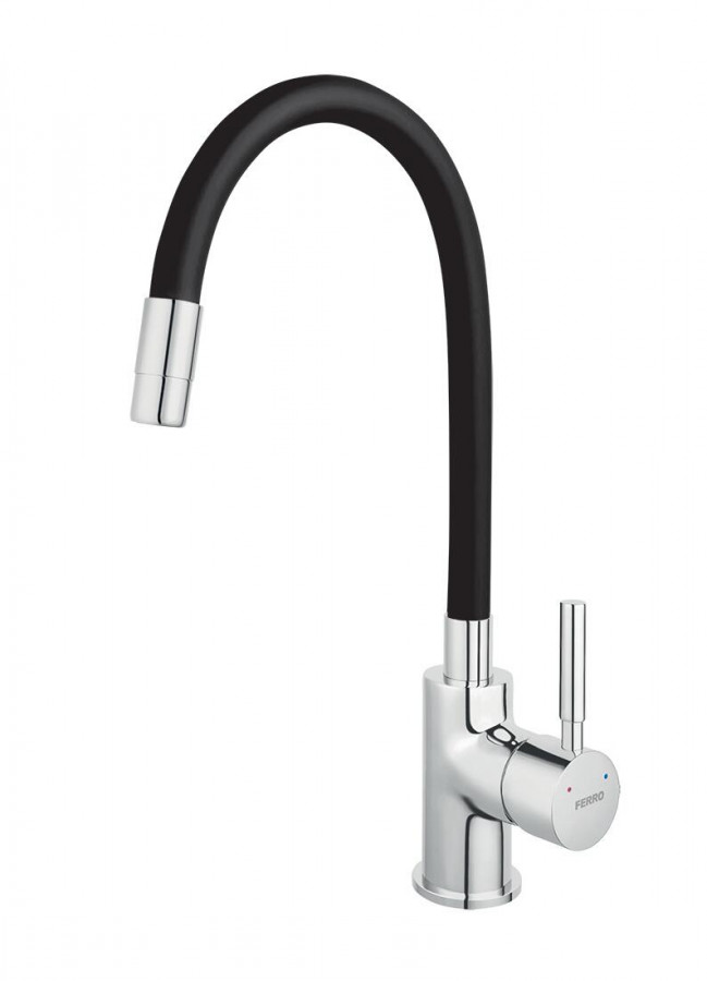Baterie FERRO 70710,0C stojánková dřezová, elastické ramínko - černá barva/Cr. Udělejte z vaší kuchyně váš oblíbený prostor. Praktická a moderní dřezová baterie s elastickým ramenem bude vaším oblíbeným pomocníkem v kuchyni. Osloví vás svou nápaditostí a ukáže vám, že i vodovodní baterie může být vkusným doplňkem vašeho interiéru. Stačí když si nastavíte rameno do vámi požadované polohy a pustíte vodu, už ho nemusíte držet jako u jiných teleskopických dřezových baterií. Omrzela vás barva? Stačí si vybrat z 8 barevných provedení a vyměnit rameno.