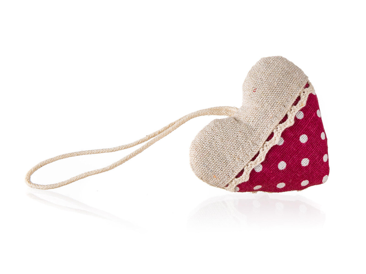 Dekorativní srdce na zavěšení, kombinace přírodní barvy a červené látky s bílým puntíkem, materiál: bavlna, rozměr 8 x 7 cm. Vhodné pouze pro dekoraci. Výška přepravní: 0,5 cm Šířka přepravní: 7 cm Hloubka přepravní: 7 cm Objem přepravní: 0,0245 dm3 Hmotnost přepravní: kg Pozor křehké: