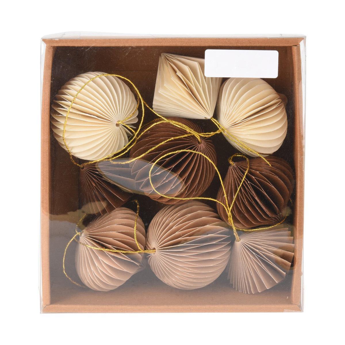 Dekorace závěsná 6 cm, KOULE, CIBULE, DIAMANT (9 ks). sada obsauje 9 ks mix druhů: koule, cibule, diamant velikost: 6 cm materiál: papír mix barev: béžová, světle hnědá, hnědá Závěsná papírová dekorace v příjemných teplých odstínech. Výška přepravní: 7 cm Šířka přepravní: 18,5 cm Hloubka přepravní: 19 cm Barva: Objem přepravní: 2,4605 dm3 Hmotnost přepravní: 0,066 kg Výška: 0 cm Materiál: Šířka: 0 cm Licence: Průměr: cm Elektroodpad: Zobrazení času: Určení nábytku: Listingový popis: Výbava: Typ: Typ strojku: Pozor křehké:
