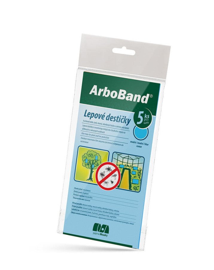 Deska lepová ArboBand MO (5 ks). barva: modrá balení: 5 ks Lepové desky k ochraně rostlin a stromů před škůdci. Věší se do blízkosti rostlin nebo přímo na rostliny a stromy. Použití je možné jak v interiérech a sklenících, tak i v exteriérech. Lapač přitahuje škůdce svou barvou. Modré desky – zelenina, pokojové rostliny, skleníkové kultury. Určené k boji proti třásněnkám, vrtalkám, molícím, smutnicím. Šířka přepravní: 11,5 cm Výška přepravní: 25 cm Hloubka přepravní: 0,2 cm Objem přepravní: 0,0575 dm3 Hmotnost přepravní: 0,0516 kg Pozor křehké:
