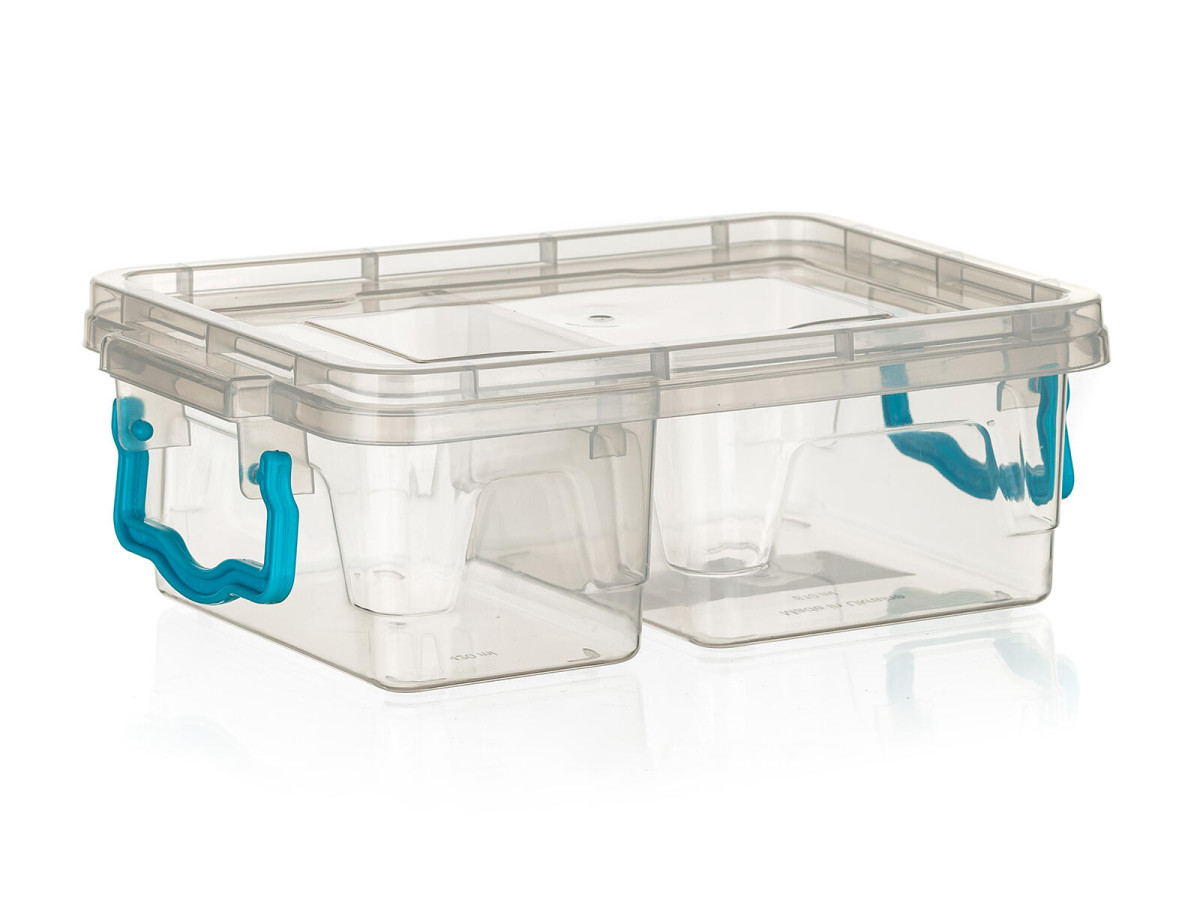 Dóza GEMA, dělená, obdélníková 0,4 + 0,6 l, PH TRA / TYRK madla. objem: 0,42 + 0,61 l materiál: plast barva: transparentní box, tyrkysová madla Dělená dóza GEMA s tyrkysovými madly má široké využití nejen v kuchyni, díky dvěma přihrádkám a transparentnímu provedení je velmi přehledná. Použití v mrazničce do -25 st. C a v mikrovlnné troubě do + 95 st. C. Objem přihrádek je 420 a 610 ml. Výška přepravní: 7 cm Šířka přepravní: 14 cm Hloubka přepravní: 22 cm Objem přepravní: 2,156 dm3 Hmotnost přepravní: kg Pozor křehké: