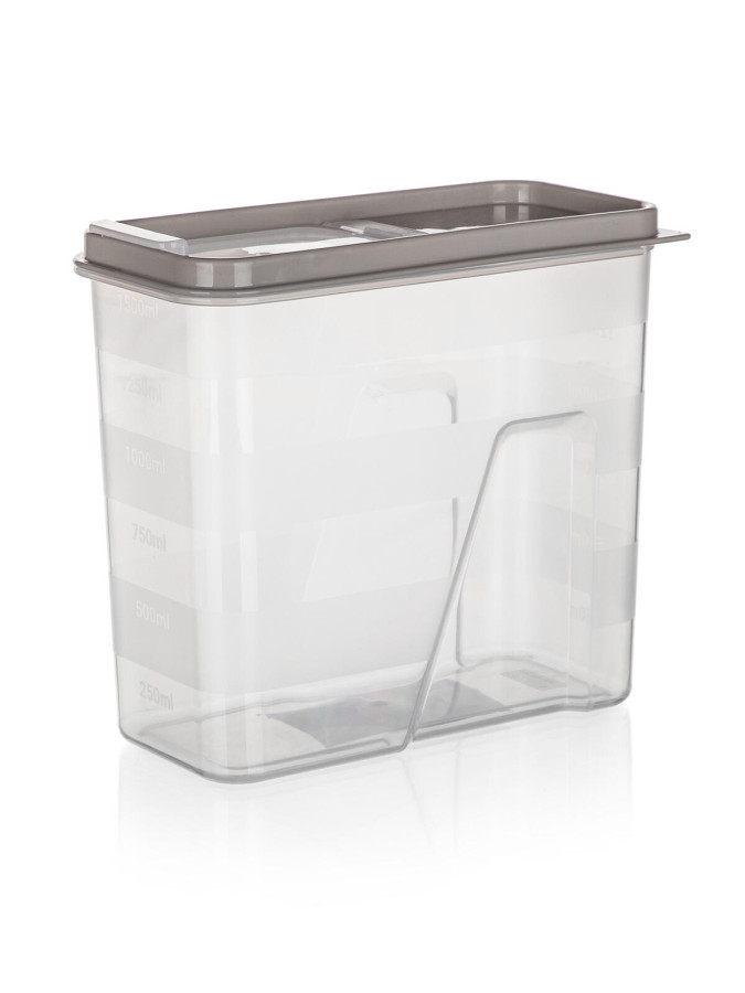 Dóza na sypké potraviny 1,5 l, PH, otevírací víčko LATTE. objem: 1,5 l materiál: plast barva: transparentní dóza, latte víčko Transparentní dávkovací plastová dóza Culinaria s víčkem v latte barvě. Dóza je praktickým pomocníkem na ukládání těstovin, luštěnin, mouky a jiných potravin. Opatřena měřící ryskou s odstupem 250 ml. Výška přepravní: 16 cm Šířka přepravní: 9 cm Hloubka přepravní: 18 cm Objem přepravní: 2,592 dm3 Hmotnost přepravní: 0,13 kg Pozor křehké: