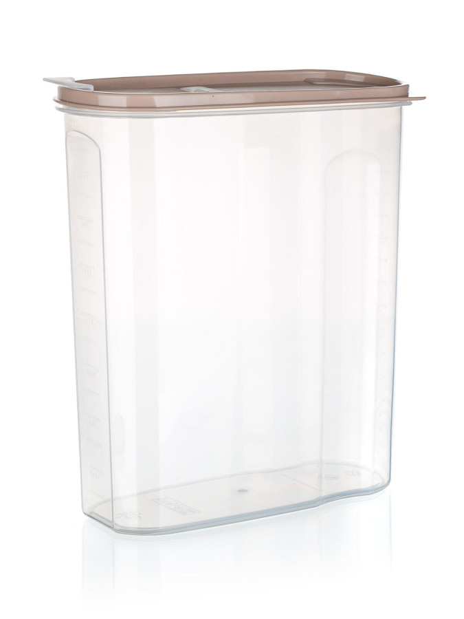Dóza na sypké potraviny RIVA, 4 l, PH, otevírací víčko HN. objem: 4 l materiál: plast barva: transparentní, hnědé víčko Transparentní plastová dóza RIVA s víčkem v hnědé barvě. Dóza je praktickým pomocníkem na ukládání těstovin, luštěnin, mouky a jiných potravin. Výška přepravní: 27 cm Šířka přepravní: 11 cm Hloubka přepravní: 25 cm Objem přepravní: 7,425 dm3 Hmotnost přepravní: kg Pozor křehké: