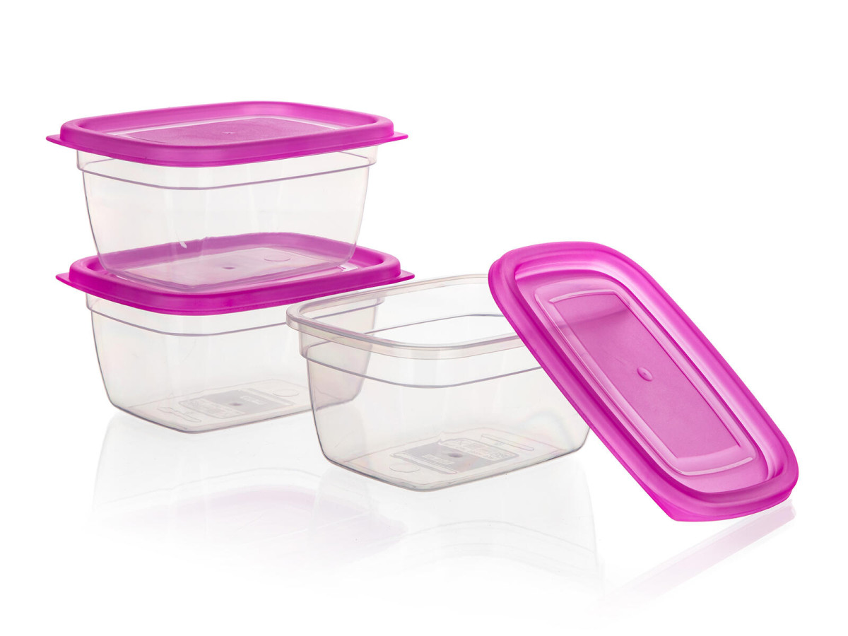 3dílná sada dóz na potraviny SUPER VALUE obsahuje 3 dózy o objemu 0,55 l, vhodné pro skladování různých potravin. Dózy jsou vyrobené z plastu a dodávají se s víky v růžové barvě. Výška přepravní: 10 cm Šířka přepravní: 11 cm Hloubka přepravní: 14 cm Objem přepravní: 1,54 dm3 Hmotnost přepravní: 0,12 kg Pozor křehké: