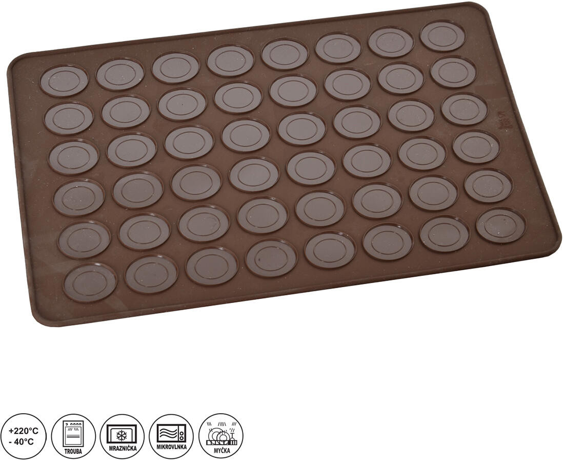Forma na makronky 48 ks, 39,5 x 29,5 x 0,3 cm, silikon HN. rozměry: 39,5 x 29,5 x 0,3 cm materiál: silikon barva: hnědá Forma na přípravu makronek - francouzské sladké speciality - barevných mandlových koláčků. Příprava je velmi snadná, výsledek vynikající. Forma nabízí přípravu makrónek dvou velikostí - pr. 3,5 cm a 2,5 cm. Naráz upečete 48 ks makronek. Formu si můžete upravit podle plechu - buď ji ostřihnete a nebo na jedné straně plechu necháte formu na boku plechu a tu řadu formiček neplníte. Snáší teplotu -40°C až + 220°C. Snadná údržba. Lze mýt v myčce na nádobí. Šířka přepravní: 29,5 cm Výška přepravní: 39,5 cm Hloubka přepravní: 0,3 cm Objem přepravní: 0,349575 dm3 Hmotnost přepravní: 0,191 kg Barva: hnědá Materiál: silikon Sada: Typ: formy a plechy Plech: Forma: Listingový popis: Určení: Pozor křehké: