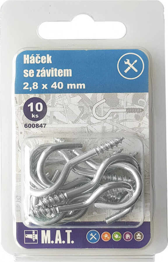 rozměry (D x pr.): 20 x 2,3 mm materiál: Zn 10 ks Háček se závitem 20 x 2,3 mm pro uchycení předmětů a břemen do různých materiálů. Šířka přepravní: 6,5 cm Výška přepravní: 14 cm Hloubka přepravní: 19,5 cm Objem přepravní: 0,195 dm3 Hmotnost přepravní: 0,02 kg Pozor křehké: