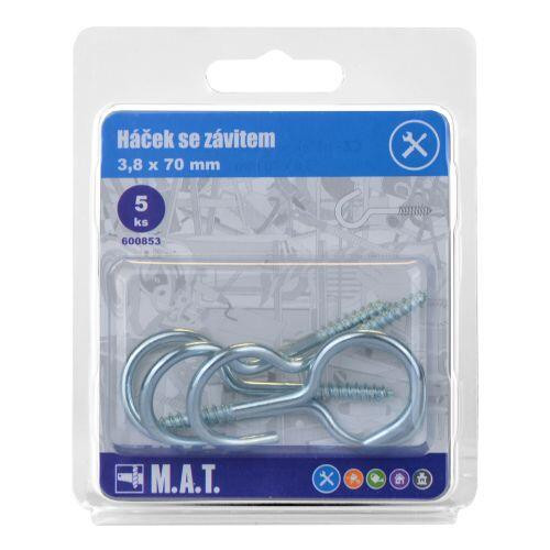 rozměry (D x pr.): 70 x 3,8 mm materiál: Zn 5 ks Háček se závitem 70 x 3,8 mm pro uchycení předmětů a břemen do různých materiálů. Šířka přepravní: 10 cm Výška přepravní: 14 cm Hloubka přepravní: 19,5 cm Objem přepravní: 0,375 dm3 Hmotnost přepravní: 0,06 kg Pozor křehké:
