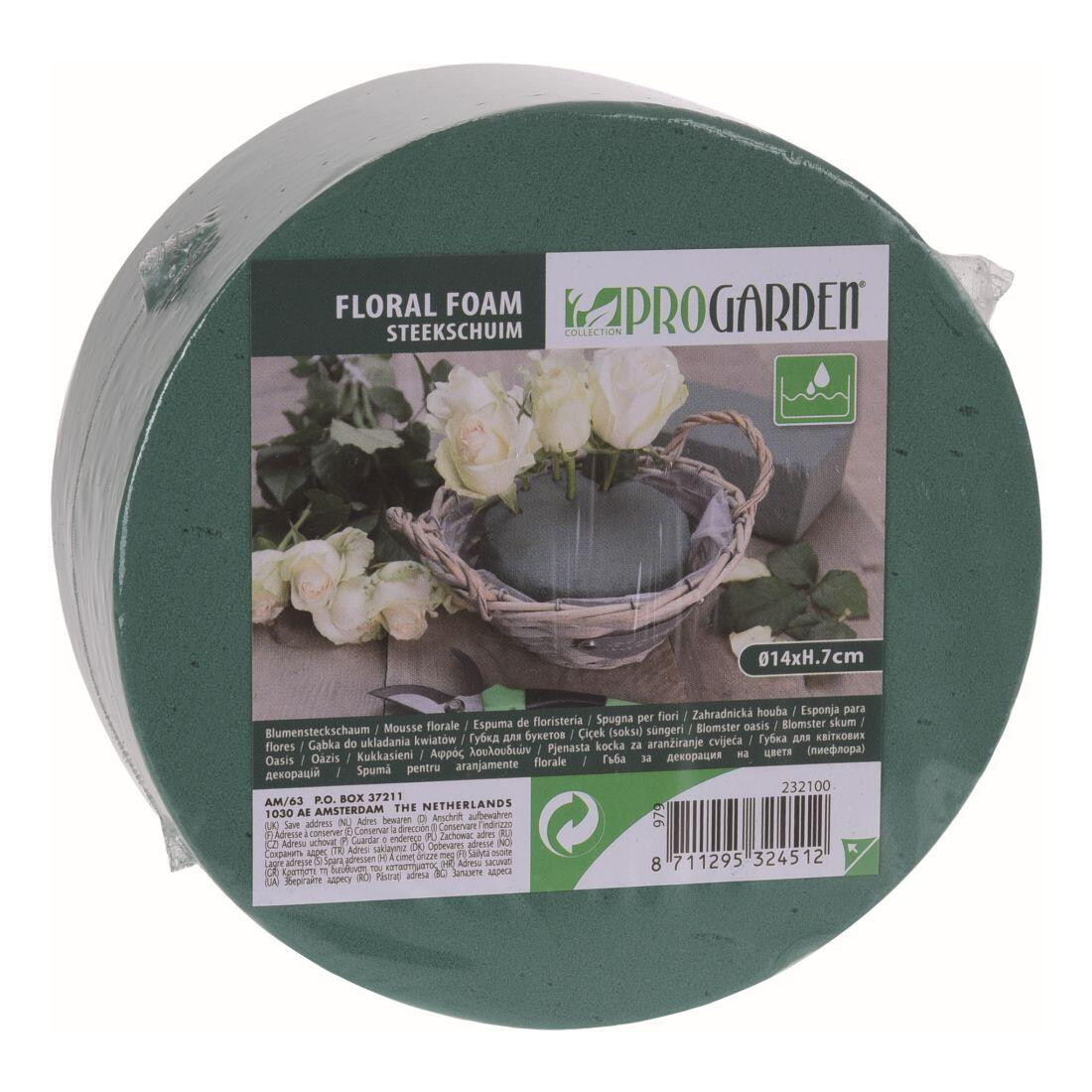 Aranžovací hmota je určena k tvoření květinových dekorací převážně pro živé květiny, protože dobře zadržuje vodu. K vytvoření květinové vazby, vánočního svícnu atd. Hmotou lze také vyplnit košík, misku, vázu či květináč, do kterých se snadněji vytvoří aranžmá. Použití: ponořit do vody a nechat nasát, po té nožem vytvarovat dle připravené nádoby. rozměry: pr. 14 cm, výška 7 cm materiál: 100% florex Šířka přepravní: 14 cm Výška přepravní: 14 cm Hloubka přepravní: 7 cm Objem přepravní: 1,37 dm3 Hmotnost přepravní: 0,017 kg Pozor křehké: