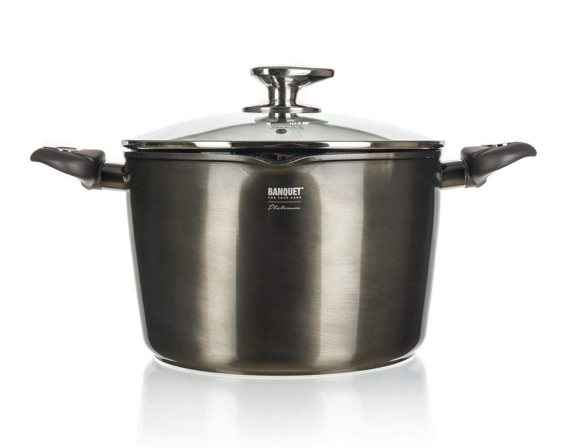Hliníkový litý kovaný hrnec s výlevkou a se skleněnou poklicí METALLIC PLATINUM s nepřílnavým povrchem o rozměru 24 x 15,5 cm, vnější karbon metalický nástřik, tloušťka stěny 3 mm, plně indukční dno, soft-touch rukojeť a nerezový knob. Nepřilnavý povrch je velmi tvrdý a odolný proti poškrábání. Hrnec je odolný proti nárazu. Šířka přepravní: 26 cm Výška přepravní: 19,5 cm Hloubka přepravní: 36 cm Objem přepravní: 18,252 dm3 Hmotnost přepravní: 2,26 kg Druh nádobí: hrnec Barva: Materiál: Průměr: cm Počet kusů v sadě: 0 Listingový popis: Elektrický ohřev: Sada hrnců: Vnitřní materiál: Sklokeramický ohřev: Ohřev v troubě: Poklice na cedění: Počet poklic: 0 Indukční ohřev: Hrnec: Objem (L): 0 l Mytí v myčce: Odnímatelná rukojeť: Určení: Pozor křehké: