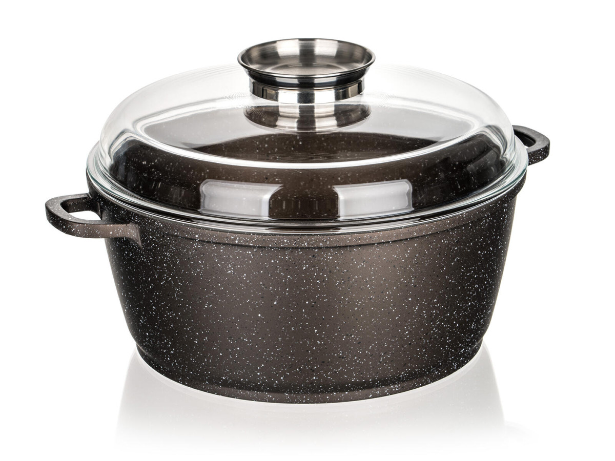 Hrnec 28 x 12,5 cm, nepřilnavý povrch, PREMIUM Dark Brown, se skleněnou poklicí, aroma knob. průměr: 28 cm výška: 12,5 cm tloušťka stěny: 1,7 mm nepřilnavý povrch barva: hnědý granitový dekor plně indukční dno skleněná poklice s aroma knoberm Hliníkový litý hrnec se skleněnou termo poklicí a aroma knobem PREMIUM DARK BROWN, s nepřilnavým povrchem. Nepřilnavý povrch je velmi tvrdý a odolný proti poškrábání. Hrnec je odolný proti nárazu a deformaci tvaru. Výška přepravní: 14,5 cm Šířka přepravní: 30 cm Hloubka přepravní: 30 cm Objem přepravní: 13,05 dm3 Hmotnost přepravní: 2,6 kg Pozor křehké: