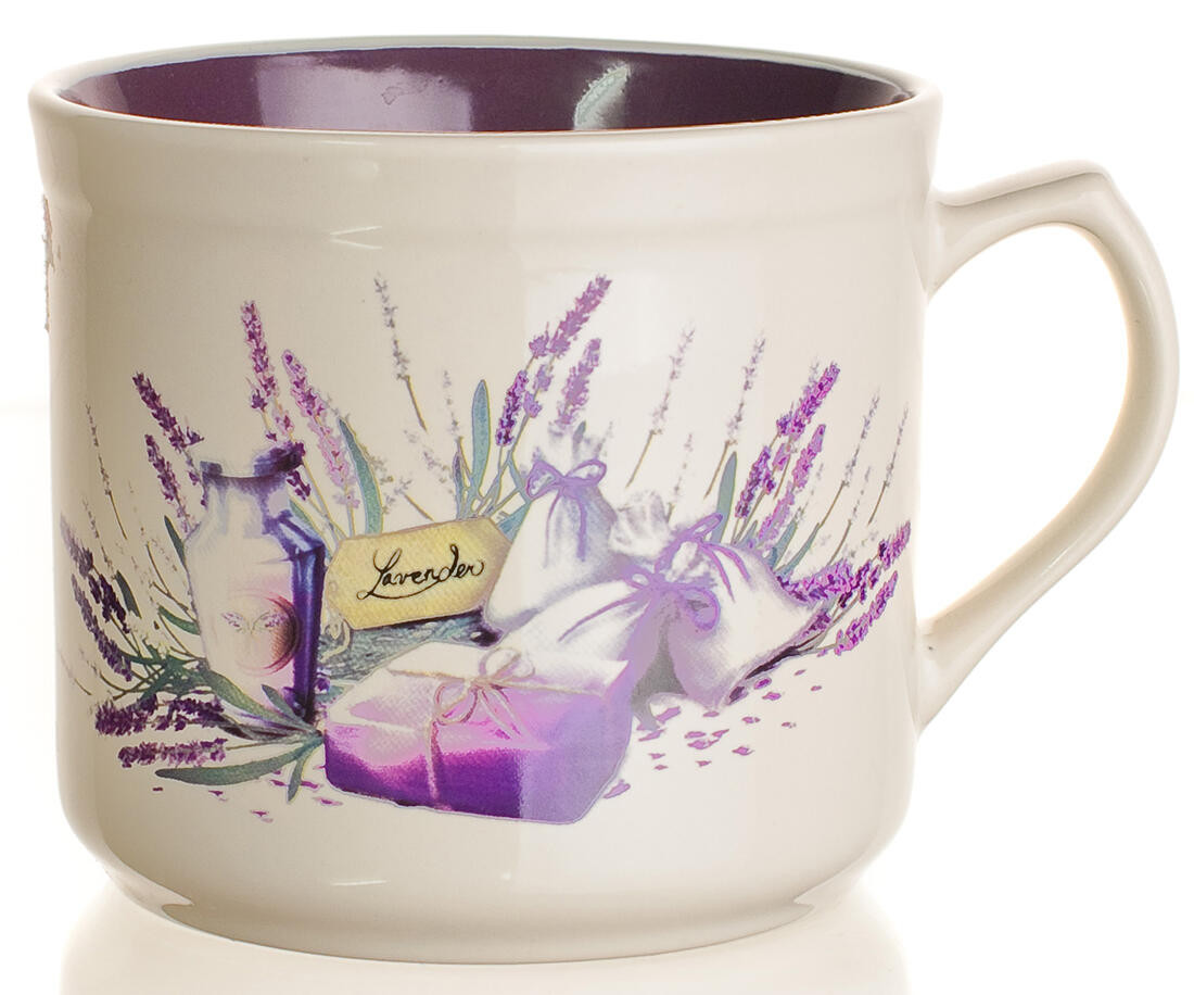Hrnek 630 ml, BIG LAVENDER, keramický. objem: 630 ml průměr: 11 cm výška: 10 cm materiál: keramika Hrnek BIG LAVENDER, dvoubarevná glazura s dekorem levandule. Hrnek lze používat do mikrovlnné trouby a mýt v myčce na nádobí (při běžném domácím užití). Šířka přepravní: 12 cm Výška přepravní: 10 cm Hloubka přepravní: 15 cm Objem přepravní: 1,8 dm3 Hmotnost přepravní: 0,437 kg Pozor křehké: