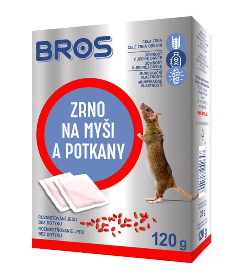 BROS zrno na myši a potkany 6x20gZrní pro likvidaci myší a potkanů obsahuje návnadu, která silně láká hlodavce a účinkuje po prvním použití. Inovativní řešení balení zrna v jednotlivých sáčcích zabraňuje přenášení vnějších vůni na jed, což je pro hlodavce přitažlivější.Účinná látka: 0,0029 % bromadiolon.Popis a působení:Zrní pro likvidaci myší uvnitř budov a likvidaci potkanů uvnitř i okolo budov. Obsahuje návnadu, která silně láká hlodavce a účinkuje již po prvním použití. Účinek zpožděný několik dní, zabraňuje hlodavcům spojovat jed s eliminací jiných jedinců. Výrobek má mumifikující účinek a obsahuje látku, která zabraňuje náhodnému požití osob a zvířat. Speciálně vybraná obilná zrna činí tento produkt vyjímečně atraktivní pro hlodavce.Dávkování:Myši: 60 g na každých 5 -10 mPotkani: 100 g na každých 5 - 10 mZrní umisťujte pouze do nástrahových stanic, které jsou zajištěny proti náhodnému otevření, a na místech, kde se vyskytují hlodavci. Výška přepravní: 18,2 cm Šířka přepravní: 13 cm Hloubka přepravní: 6,4 cm Objem přepravní: 1,51424 dm3 Hmotnost přepravní: 0,12 kg Pozor křehké: