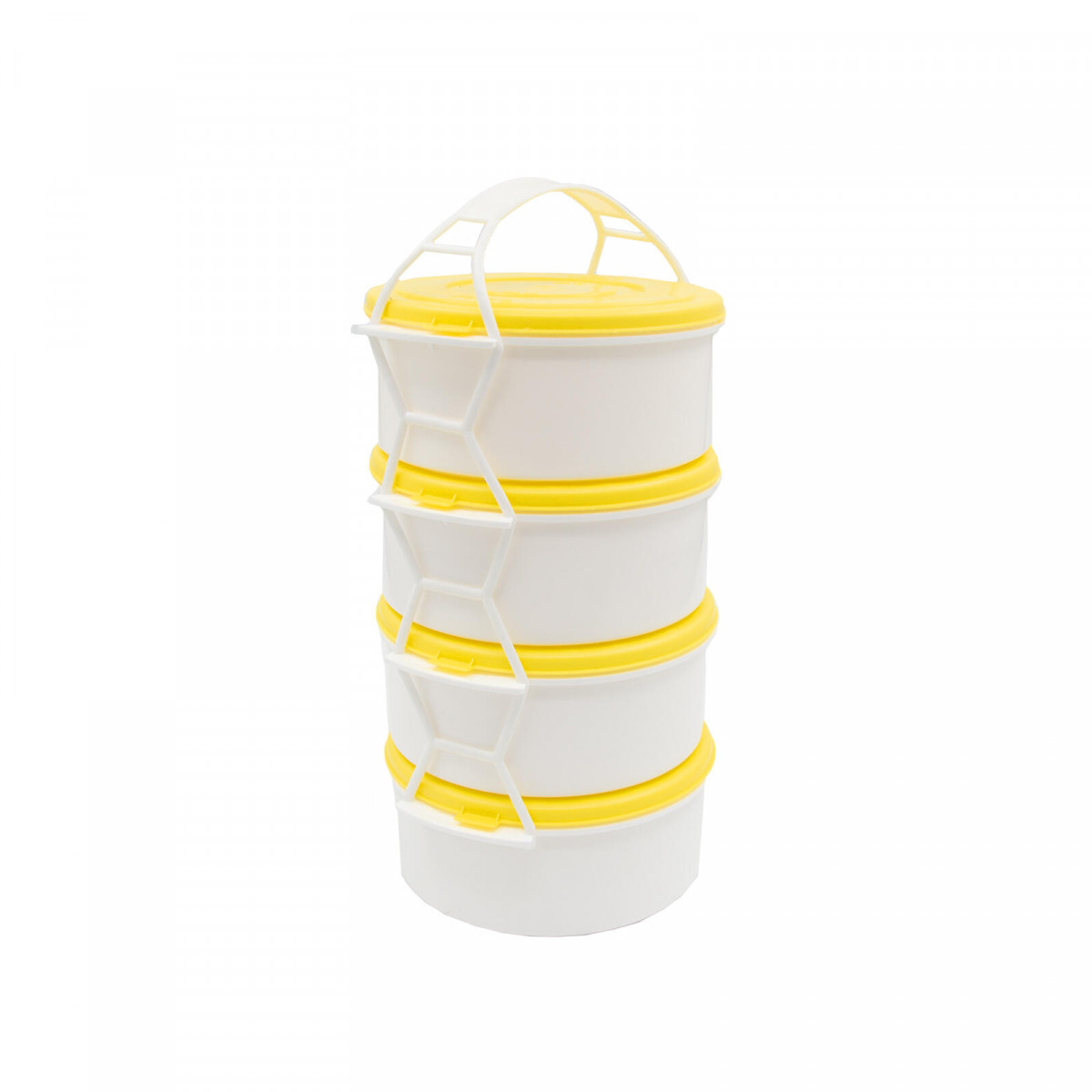 4 díly: 4 x 1,0 l materiál: plast Box na ukládání a přepravu jídla, složený ze 4 dílů, které jsou navzájem propojené držadlem.