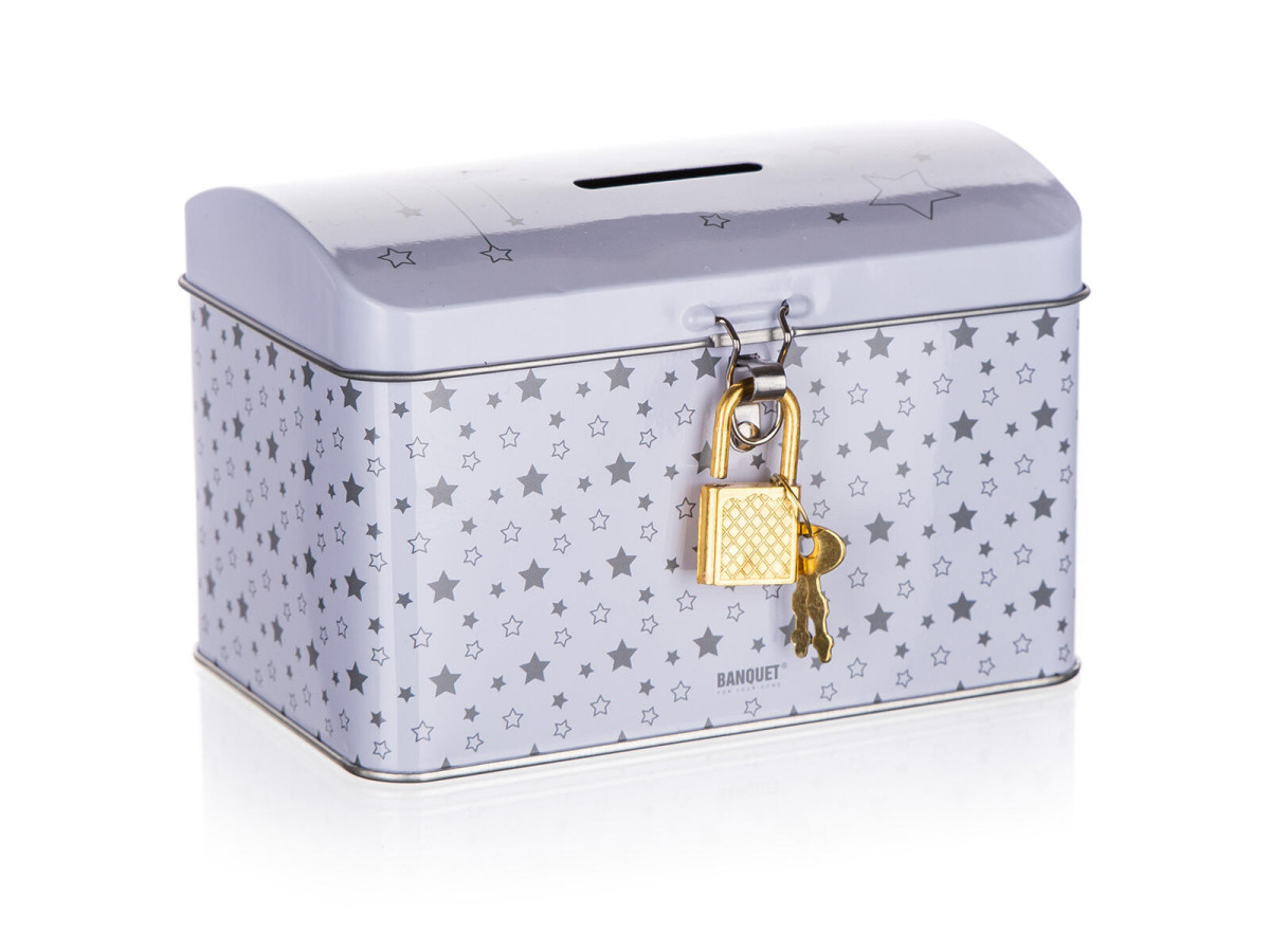 Kasička TRUHLA 12,8 x 8,4 x 8,4 cm, plechová, bílá. rozměry: 12,8 x 8,4 x 8,4 cm materiál: plech barva: bílá Plechovka - kasička truhla 4KIDS v bílé barvě s dekorem hvězdiček, vhodné pro šetření peněz. Truhla se zámkem a odnímatelným víkem. Výška přepravní: 9 cm Šířka přepravní: 9 cm Hloubka přepravní: 14 cm Objem přepravní: 1,134 dm3 Hmotnost přepravní: 0,12 kg Pozor křehké:
