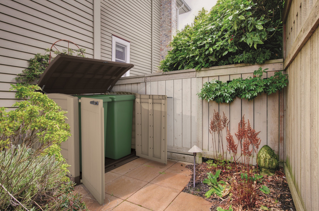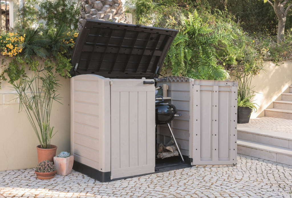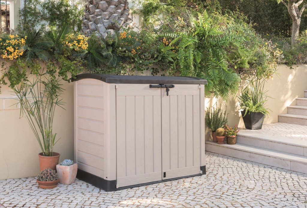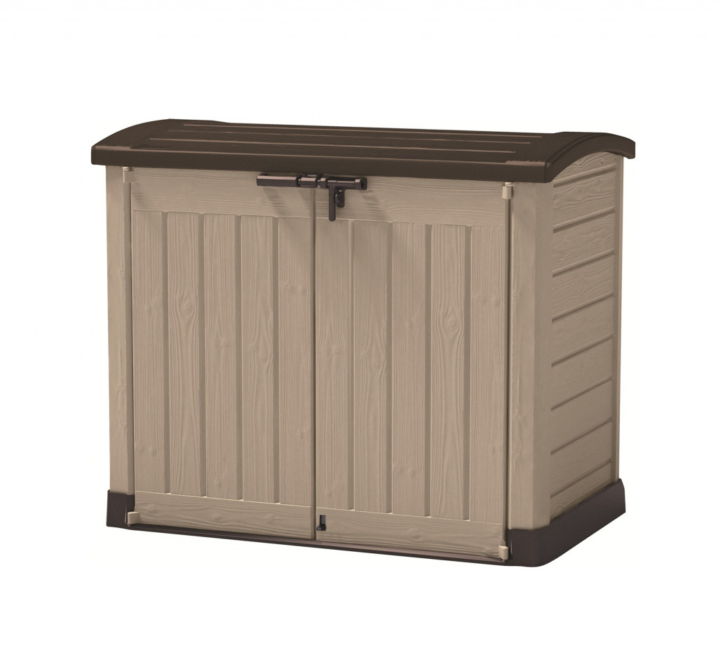 Možnost instalace vnitřní police zvyšuje funkčnost výrobku. Úložná skříň se hodí všude, kde je nutné uschovat zahradní doplňky, nářadí nebo třeba popelnice (dvě velké popelnice o objemu 240l).