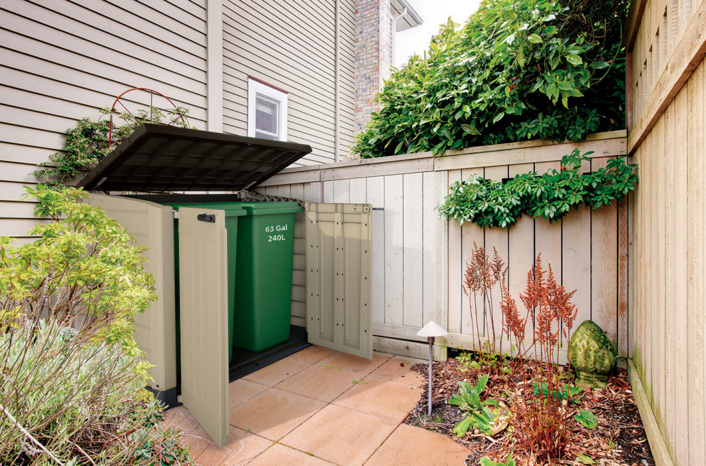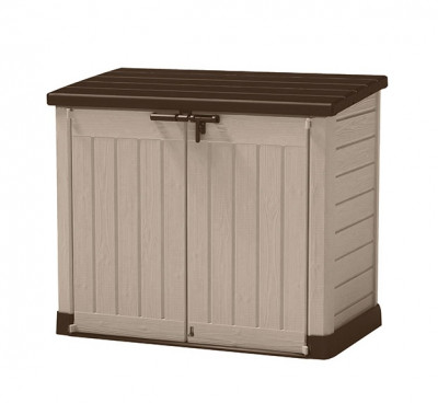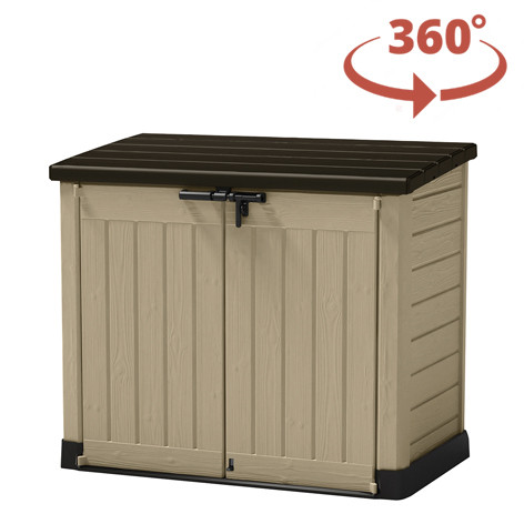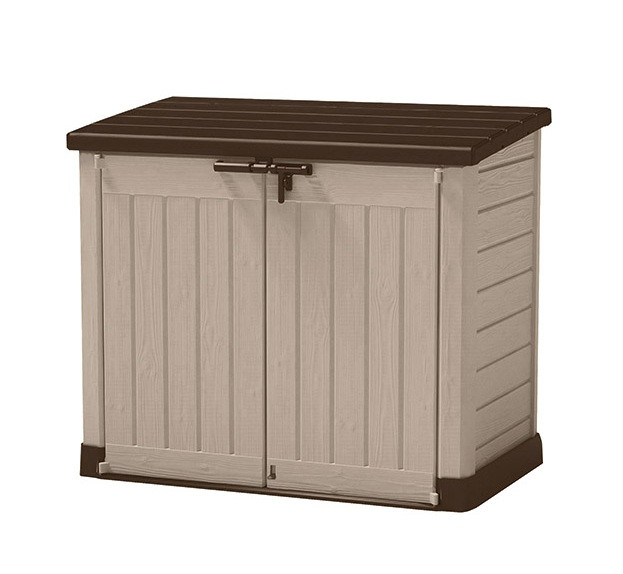 Béžovo-hnědý přístřešek nabízí kapacitu 1200 l pro uložení popelnic, bazénové technologie a vybavení či zahradního nářadí