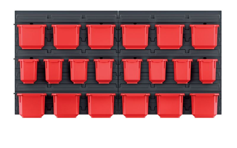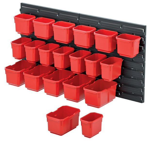 Závěsný panel obsahuje 20 boxů na nářadí, vhodný do dílny i garáže.