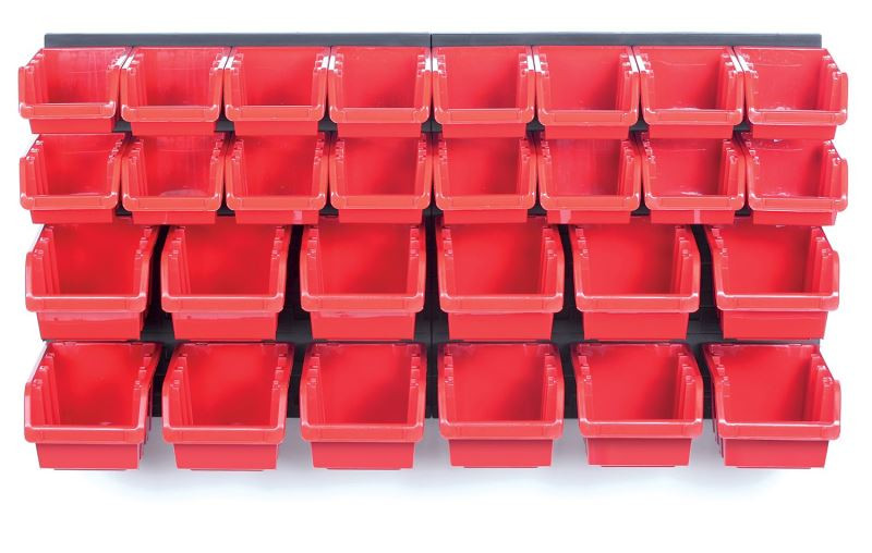 Závěsný panel obsahuje 28 boxů na nářadí, vhodný do dílny i garáže.