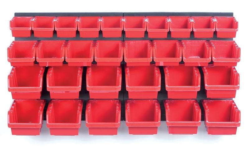 Závěsný panel obsahuje 30 boxů na nářadí, vhodný do dílny i garáže.