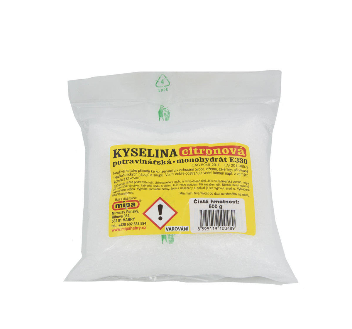 Kyselina citronová 500 g. hmotnost: 500 g Používá se jako přísada ke konzervaci a k ochucení ovoce, džemů, zeleniny, nápojů a sirupů. Velmi dobře odstraňuje vodní kámen v kávovarech a konvicích. Výška přepravní: 3 cm Šířka přepravní: 14 cm Hloubka přepravní: 14 cm Objem přepravní: 0,588 dm3 Hmotnost přepravní: 0,5 kg Pozor křehké: