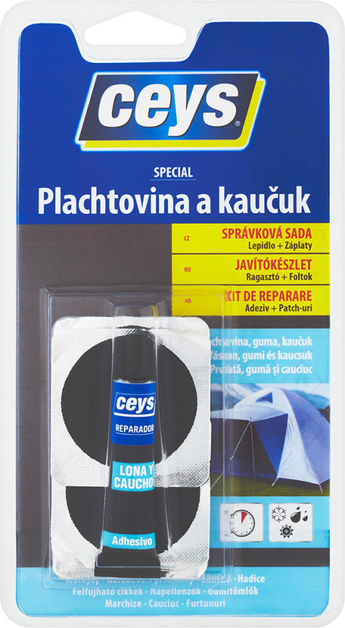 Lepidlo na plachtovinu a kaučuk 7 ml + 4 záplaty CEYS. Lepidlo na plachtovinu a kaučuk CEYS spojuje a opravuje malé otvory a roztržení na plachtovinách a površích z gumy či kaučuku s extrémní jednoduchostí, rychlostí a účinností. VHODNÉ MATERIÁLY: guma, kaučuk, neopren, plachtovina TEPLOTNÍ ODOLNOST: -10 až +75 °C objem: 7 ml 4 záplaty Šířka přepravní: 11,5 cm Výška přepravní: 23,5 cm Hloubka přepravní: 24 cm Objem přepravní: 0,943 dm3 Hmotnost přepravní: 0,0324 kg Objem: 7 ml Typ látky: Lepidlo Způsob aplikace: Listingový popis: Pozor křehké: