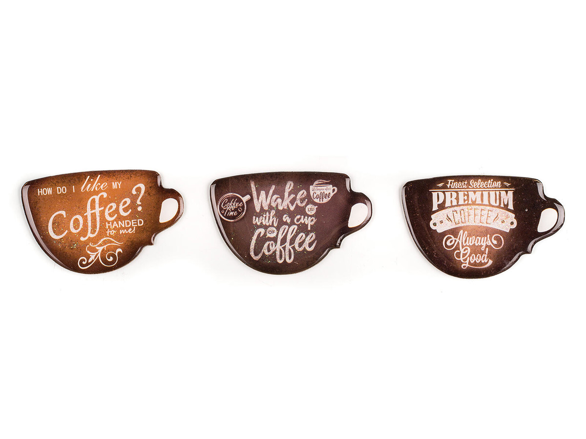 Magnetky COFFEE mix dekorů (3 ks). balení: 3 ks Sada 3 ks ozdobných magnetek na lednici s dekorem COFFEE. Magnetky slouží nejen jako dekorace v kuchyni, ale mohou najít i praktické využití např. na připevnění receptů na lednici. Šířka přepravní: 8 cm Výška přepravní: 0,5 cm Hloubka přepravní: 28 cm Objem přepravní: 0,112 dm3 Hmotnost přepravní: 0,075 kg Pozor křehké: