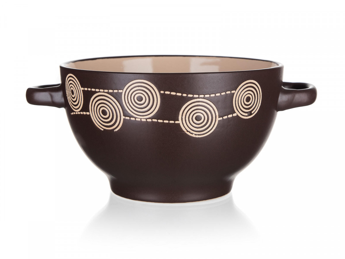 Miska 13,5 cm, SPIRÁLA, HN tm., keramická. průměr: 13,5 cm výška: 8 cm objem: 660 ml materiál: keramika barva: tmavě hnědá Miska s uchy s dekorem Spirála, je vyrobena z keramiky. Misku lze používat do mikrovlnné trouby a mýt v myčce na nádobí. Výška přepravní: 8 cm Šířka přepravní: 14 cm Hloubka přepravní: 18 cm Objem přepravní: 2,016 dm3 Hmotnost přepravní: 0,338 kg Pozor křehké: