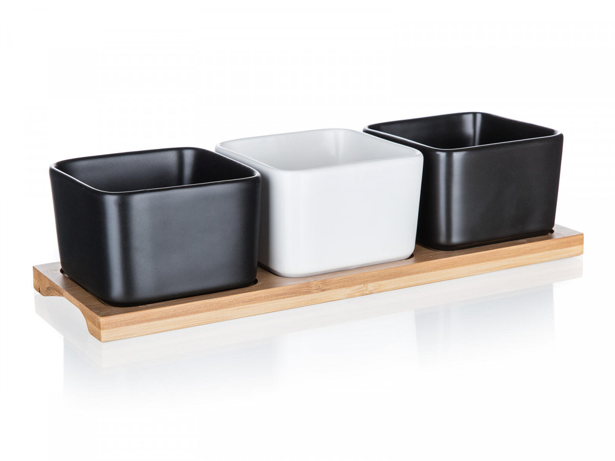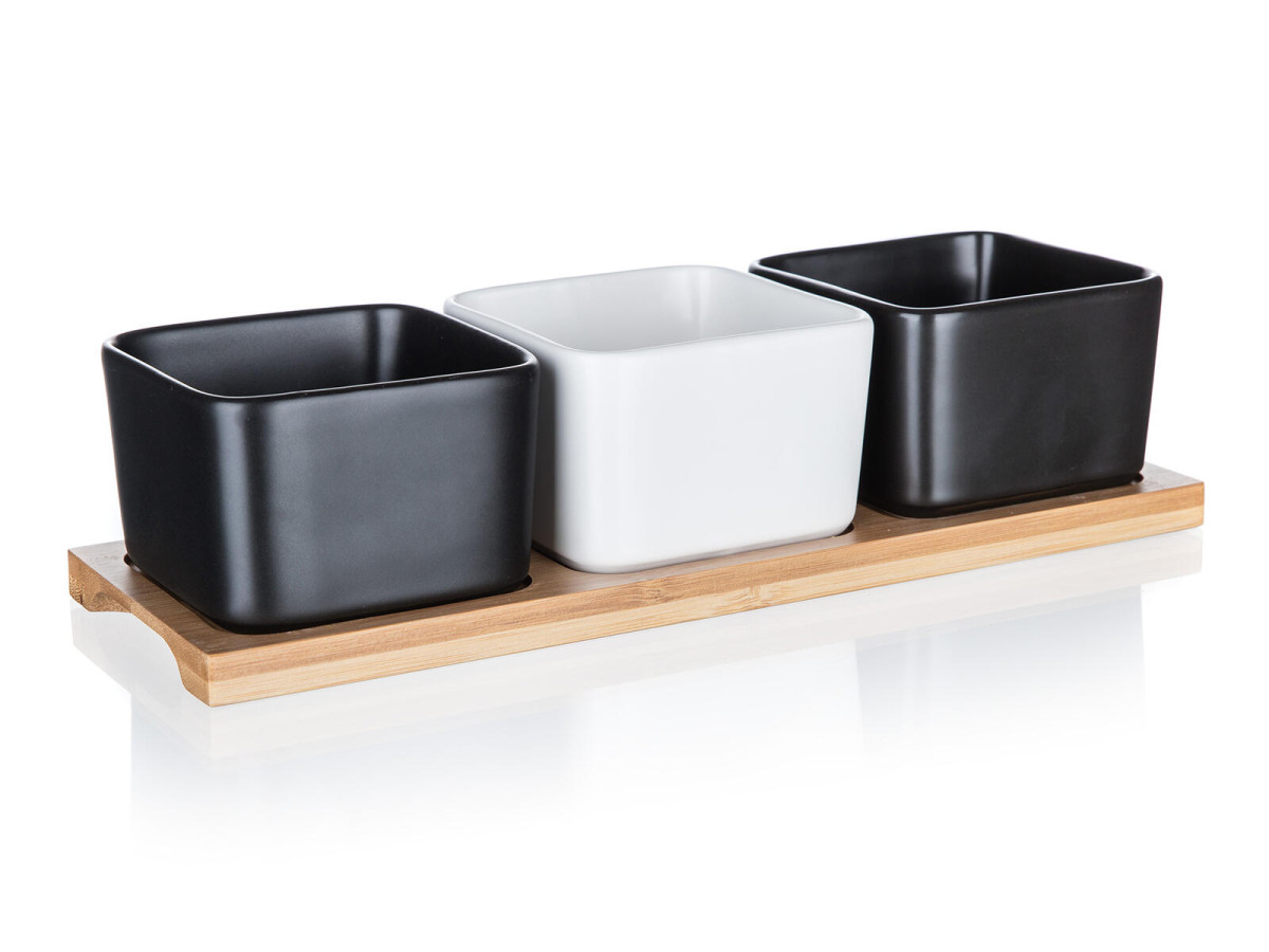 Miska sada 4díl. (3 x miska, 1 x tác) 28,2 x 9,8 x 7 cm, BRILLANTE, porcelán BÍ, ČER / bambus. sada obsahuje: 3 x porcelánová miska (2 x černá, 1 x bílá) 1 x bambusový tác celkové rozměry: 28,2 x 9,8 x 7 cm Sada 3 hranatých porcelánových misek, 2 v černé a 1 v bílé barvě na bambusovém podnosu, je ideální pro servírování různých druhů oříšků, sušeného ovoce, oliv apod. myčka: ano mikrovlnka: ano UPOZORNĚNÍ: bambusový tác otírat pouze vlhkým hadříkem Výška přepravní: 7,5 cm Šířka přepravní: 11 cm Hloubka přepravní: 30 cm Objem přepravní: 2,475 dm3 Hmotnost přepravní: 1,22 kg Pozor křehké: Ano
