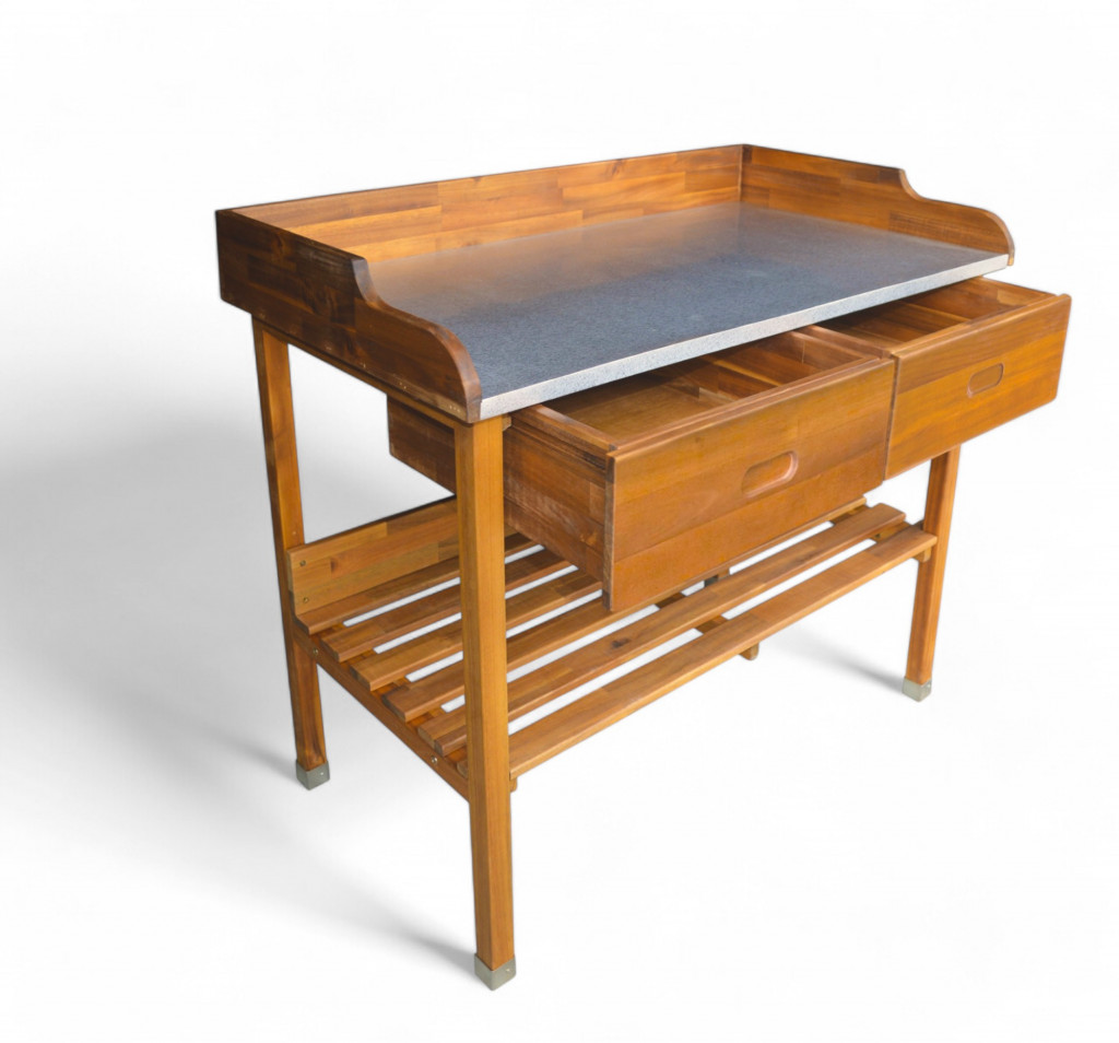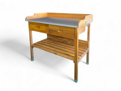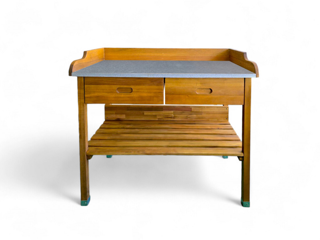 Dřevěný stůl vyrobený z kvalitního akátového dřeva. Stůl je vhodný na grilování nebo třeba přesazování květin. Obsahuje dvě zásuvky, odkládací desku a na bocích háčky na pověšení.