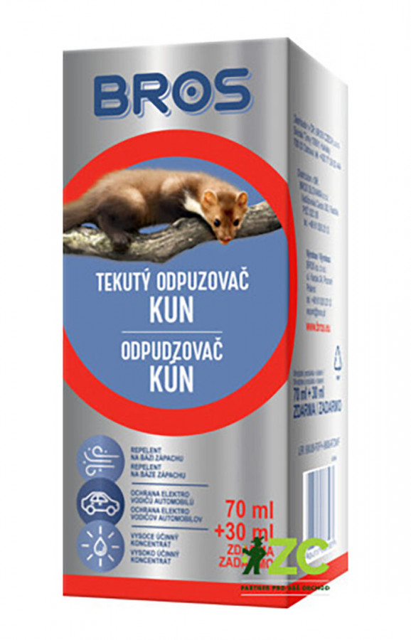 Odpuzovač kun tekutý 100 ml, BROS. objem: 100 ml Tekutý přípravek účinně odpuzující kuny. Lze jej použít v interiérech, automobilech, veřejných i obytných prostorách, garážích, půdách, hospodářských prostorách, ale také na otevřených prostorech. Za příznivého počasí zůstává účinná až 8 týdnů. Po intenzivních srážkách v otevřených prostorách aplikaci opakujte. Výška přepravní: 13 cm Šířka přepravní: 5,6 cm Hloubka přepravní: 5,6 cm Objem přepravní: 0,40768 dm3 Hmotnost přepravní: 0,207 kg Pozor křehké: