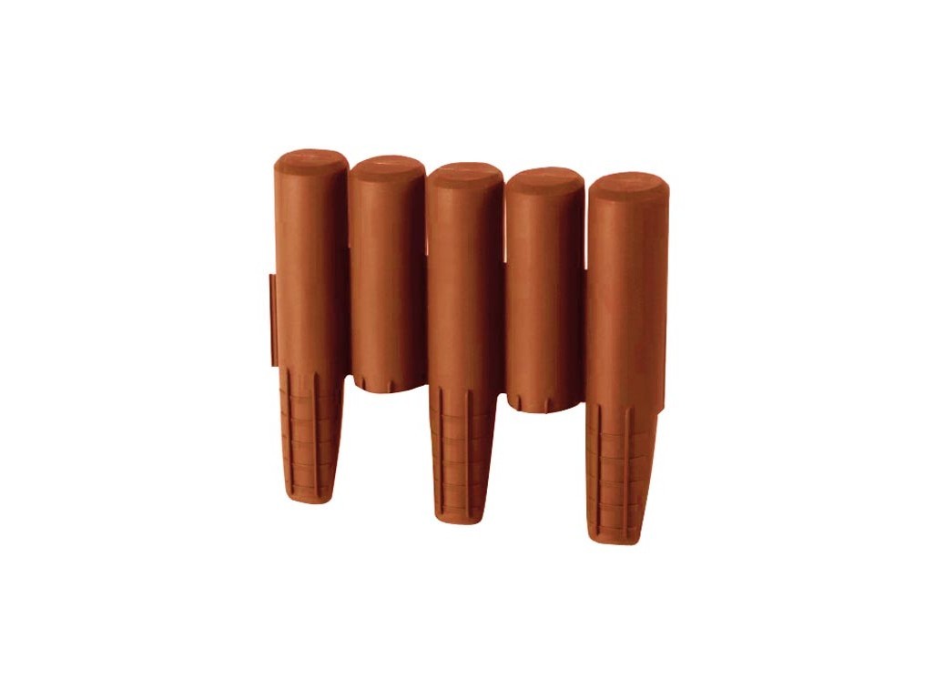Zahradní kolíková palisáda z kvalitního plastu, mrazu odolný, ohebný. Vhodný pomocník při zakládání záhonků, jednoduše oddělíte záhonky od cestiček nebo trávníků, možné vytvoření různých tvarů záhonků. Průměr kolíku 5 cm, výška 24 cm, V balení 10 ks v celkové délce 2.7 m. Barva terakota.