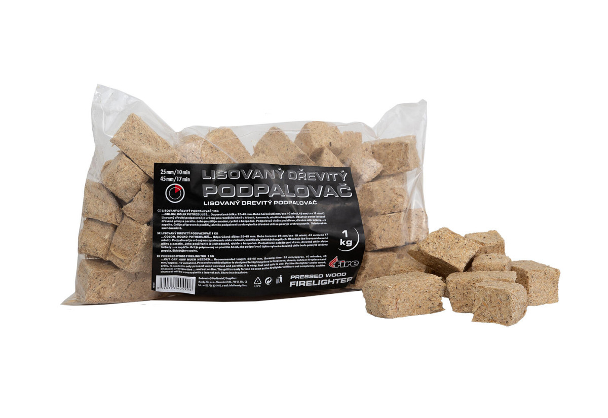 Podpalovač dřevitý lisovaný 1 kg. Lisovaný dřevitý podpalovač je určený pro rozdělání ohně v krbech, kamnech, ohništích a grilech. Obsahuje pouze lisované dřevěné piliny a parafín. Jeho použití je snadné, rychlé a bezpečné. Podpalovač vložte pod dřevo, dřevěné uhlí, brikety … a zapalte. Gril je připraven k použití, jakmile podpalovač zcela vyhoří a dřevěné uhlí se pokryje vrstvou popela. Skladovat na suchém místě. doporučená délka: 25 - 45 m doba hoření: 25 mm / cca 10 minut, 45 mm / cca 17 minut Výška přepravní: 9 cm Šířka přepravní: 13 cm Hloubka přepravní: 25,5 cm Objem přepravní: 2,9835 dm3 Hmotnost přepravní: 1 kg Pozor křehké:
