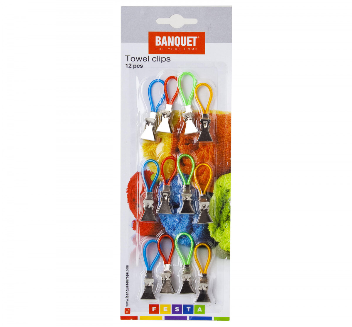 Poutko na utěrky kov. (12 ks). materiál: kov mix barev balení: 12 ks Klipsy na utěrky / ručníky ACCASA. Poutka slouží k zavěšení utěrek a ručníků a jsou dodávány v mixu barev. Šířka přepravní: 10 cm Výška přepravní: 1,5 cm Hloubka přepravní: 27 cm Objem přepravní: 0,405 dm3 Hmotnost přepravní: 0,038 kg Pozor křehké: