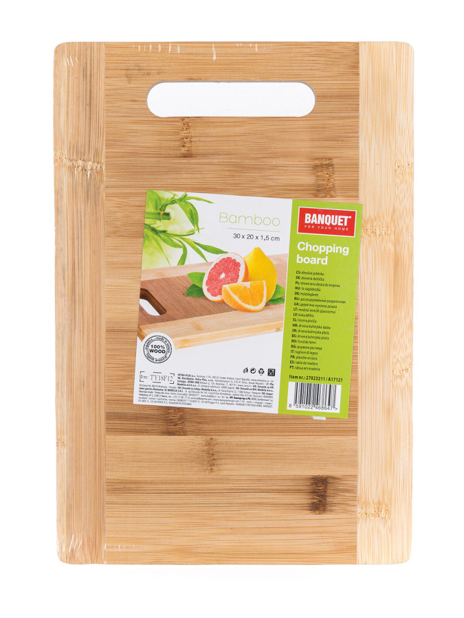 Prkénko s otvorem 30 x 20 x 1,5 cm, BRILLANTE, bambus. rozměry: 30 x 20 x 1,5 cm materiál: bambusové dřevo Bambusové krájecí prkénko je vhodné na krájení masa, zeleniny a dalších potravin. Prkénko je vyrobeno z bambusu v dvojbarevném provedení a je opatřeno praktickým otvorem pro zavěšení. Šířka přepravní: 20 cm Výška přepravní: 1,5 cm Hloubka přepravní: 30 cm Objem přepravní: 0,9 dm3 Hmotnost přepravní: 0,532 kg Pozor křehké: Barva: Výška: 1,5 cm Materiál: dřevo Šířka: 20 cm Délka: 30 cm Protiskluzové nožičky: Vhodné do myčky: Listingový popis: Určení: