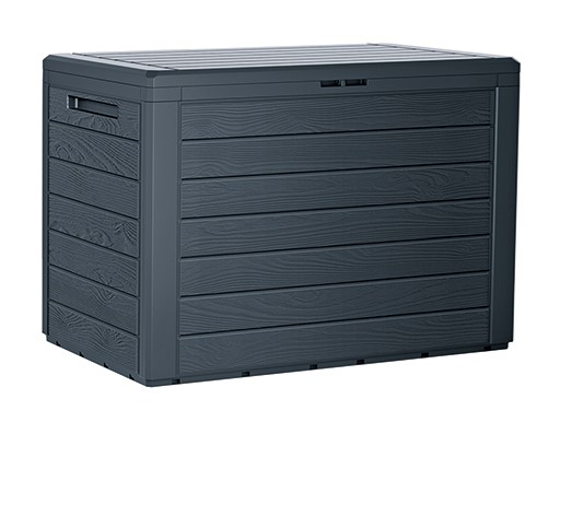 Zahradní box na polstry Woodebox antracit 190l s atraktivním vzhledem dřevěných prken. Objemný zahradní box je dokonalým venkovním doplňkem zahrad nebo teras, který Vám pomůže ovládnout každý nepořádek. Box je lehký, odvětraný a chrání uschované předměty před náhlým deštěm. Lehce v něm uschováte polštáře ze zahradního nábytku, deky, zahradní potřeby, menší nábytek nebo hračky pro děti. Vestavěný držák s možností uzamčení vám dovolí zamknout cennější věci uvnitř. Kvalitní, bezúdržbový box je odolný vůči atmosférickým vlivům a nemusí se nijak konzervovat. Jednotlivé části boxu se zacvakají do sebe, takže vám jeho sestavení nezabere moc času.Boxy není vhodné vystavovat přímému dešti, nejsou vodotěsné.