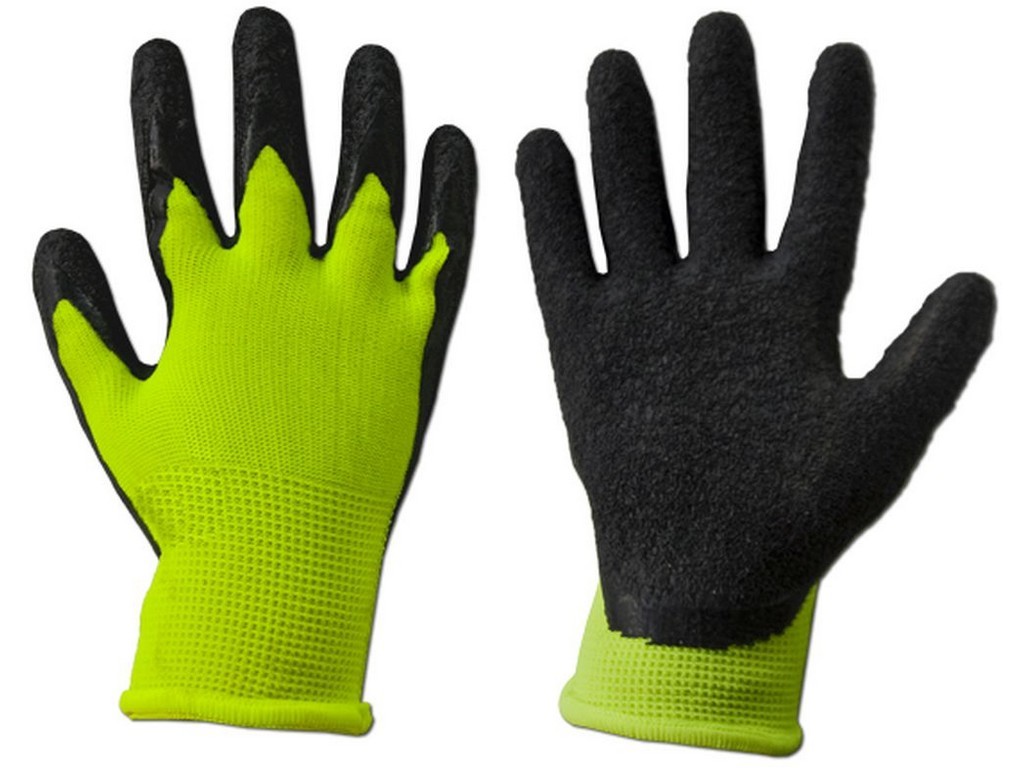Rukavice pokryté latexem, vyrobeno z polyesteru 13, odolné proti pořezání a roztržení.