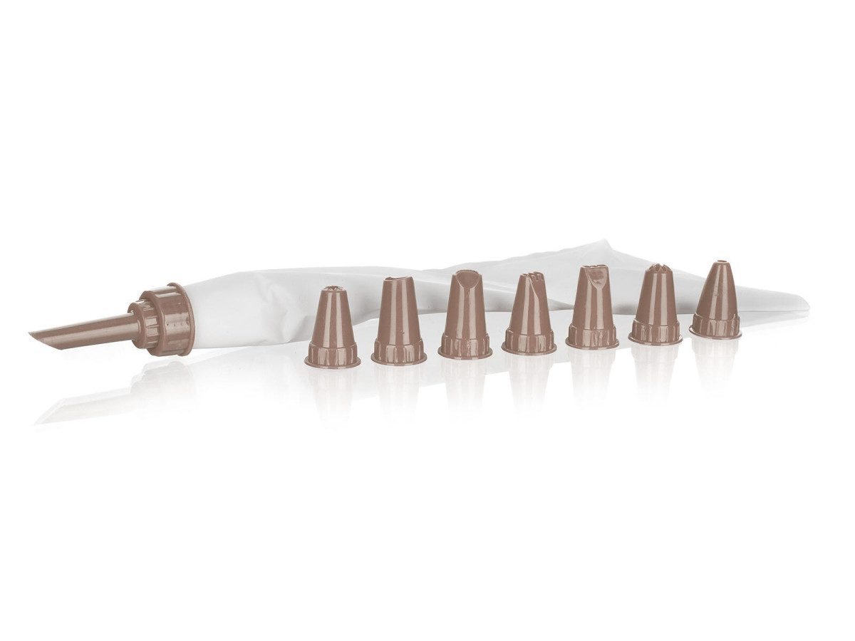 Sáček zdobicí na dorty PH + 8 nástavců PH HN, CULINARIA. sada obsahuje: 1 x zdobící sáček 8 různých druhů trysek, materiál plast barva: hnědá Zdobička CULINARIA je vynikající pomocník ke zdobení a plnění cukrářských i jiných pokrmů. Sada obsahuje 1 zdobící sáček a 8 různých druhů trysek, které vytvářejí různé druhy dekorů. Sada je vyrobena z odolného plastu a není vhodná do myčky na nádobí. Výška přepravní: 3,5 cm Šířka přepravní: 13 cm Hloubka přepravní: 22 cm Objem přepravní: 1,001 dm3 Hmotnost přepravní: 0,08 kg Pozor křehké: