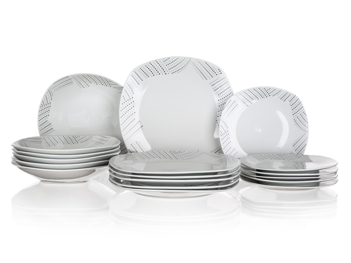 Sada jídelní CHARME square 18díl., porcelánová. sada obsahuje: 6 x dezertní talíř, diagonála 20 cm, šířka 18,5 cm 6 x hluboký talíř, diagonála 23 cm, šířka 22 cm 6 x mělký talíř, diagonála 27 cm, šířka 25 cm 8dílná talířová sada square CHARME je vyrobena z porcelánu. Talíře lze používat do mikrovlnné trouby a mýt v myčce na nádobí. Výška přepravní: 25,5 cm Šířka přepravní: 12 cm Hloubka přepravní: 47 cm Objem přepravní: 14,382 dm3 Hmotnost přepravní: 8,047 kg Pozor křehké: