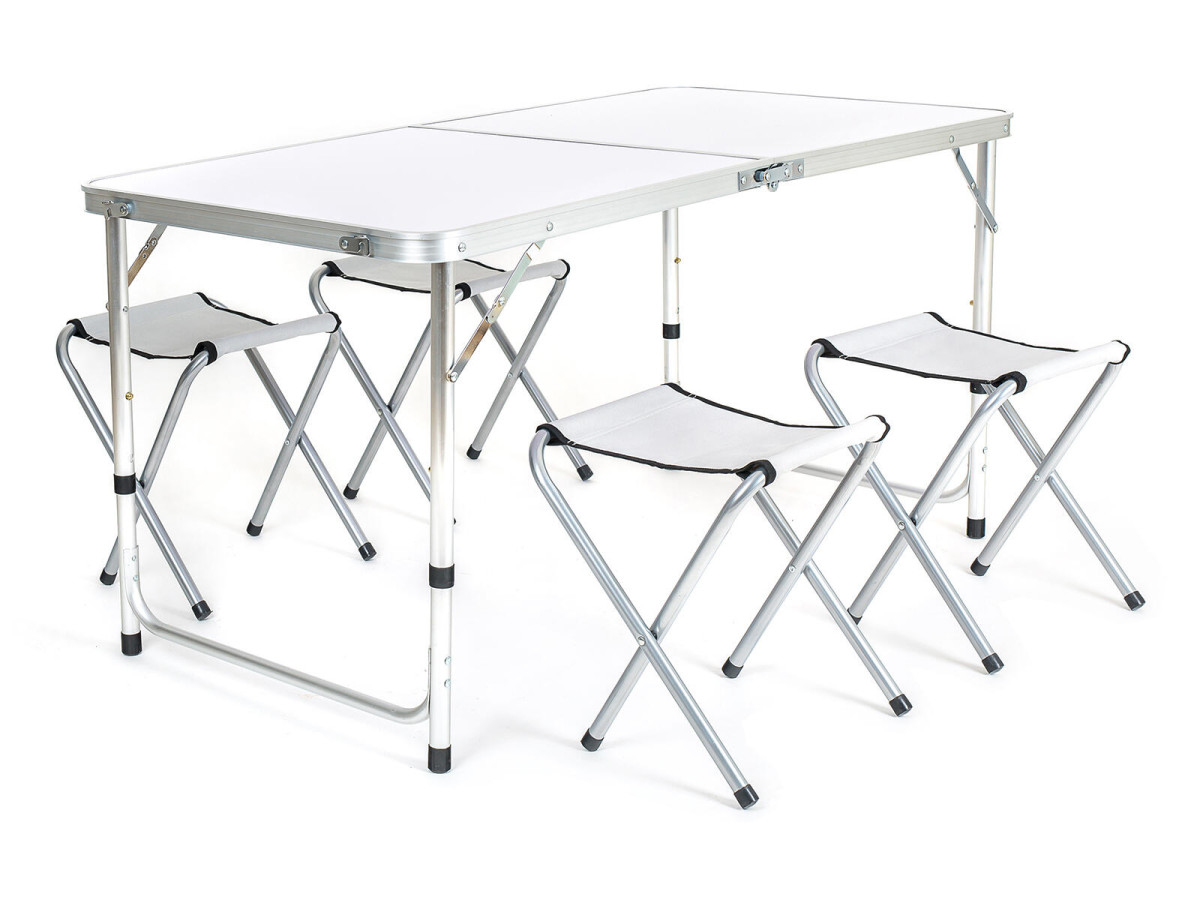 Set kemping BILBAO stůl Al + 4 stoličky. rozměry stolu: 120 x 60 cm nastavitelná výška stolu: 70 / 62 / 55 cm rozměry stoličky: 33 x 31 x 35 cm nosnost stoličky: 100 kg Kampingová sada BILBAO obsahuje stůl s konstrukcí z hliníku a 4 ocelové stoličky. Sada je vhodná pro kemping, cestování, outdoor, ale i na zahradu. Její nespornou výhodu je složení do kufříku o rozměrech 62 x 7,5 x 63 cm pro snadné přenášení. Výška přepravní: 7,5 cm Šířka přepravní: 62 cm Hloubka přepravní: 62 cm Objem přepravní: 28,83 dm3 Hmotnost přepravní: 7,068 kg Pozor křehké: