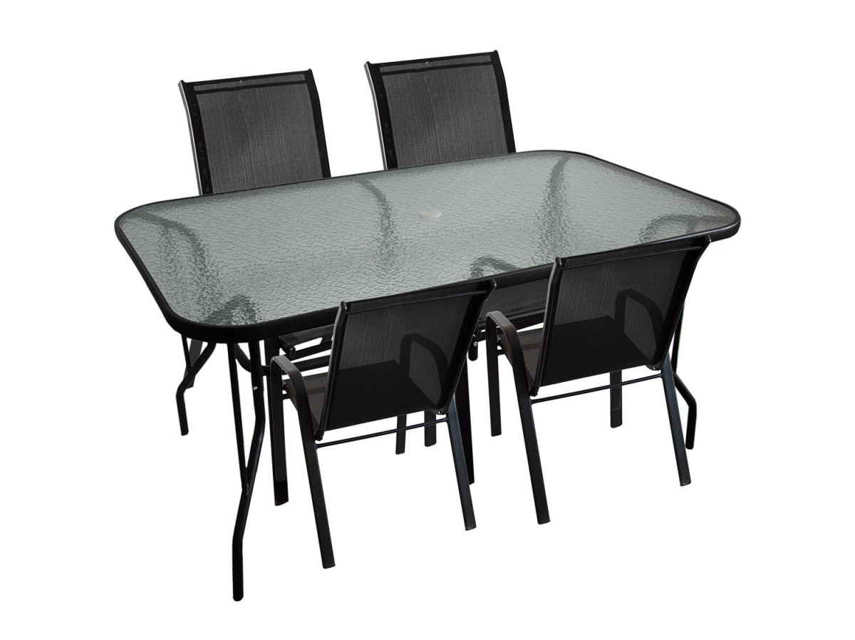 Set zahradní ocel / textilén / sklo, stůl + 4 židle, ČER. - jídelní zahradní sestava obsahuje 1 stůl + 4 židle - rozměry stolu: 150 x 90 x 72 cm, ocelová trubka a rám: 35 x 15 mm, průměr 24 mm, průměr 19 mm - tvrzené sklo 5 mm, s dekorativní strukturou - rozměry židle: 67 x 55 x 91 cm - ocelová trubka: 42 x 14 mm, 23 x 10 mm - židle jsou v případě potřeby uskladnění stohovatelné - výplet židlí z Textilénu 2 x 1 - prodyšný, omyvatelný materiál, který zajistí příjemné posezení Zahradní nábytek pro čtyři, s prostorným stolem, u kterého se nebudete tísnit a pohodlně si vychutnáte každé Vaše jídlo, ať už s rodinou nebo přáteli. Užijte si pohodově každou oslavu nebo grilovačku. Snadná údržba - k čištění povrchu stolu a židlí použijte mokrý hadřík nebo utěrku. Nikdy nečistěte abrasivními čisticími prostředky a drátěnkami, abyste neporušili práškový antikorozní nátěr. V zimě nebo když zahradní nábytek nepoužíváte delší dobu, uskladněte set do vnitřních prostor. K tomuto jídelnímu setu si můžete přikoupit další zahradní židle - pod MAT zkratkou č. 797008. nosnost židle: 120 kg nosnost stolu: 70 kg Šířka přepravní: 60 cm Výška přepravní: 85 cm Hloubka přepravní: 58 cm Objem přepravní: 295,8 dm3 Hmotnost přepravní: 4,5 kg Pozor křehké: Ano
