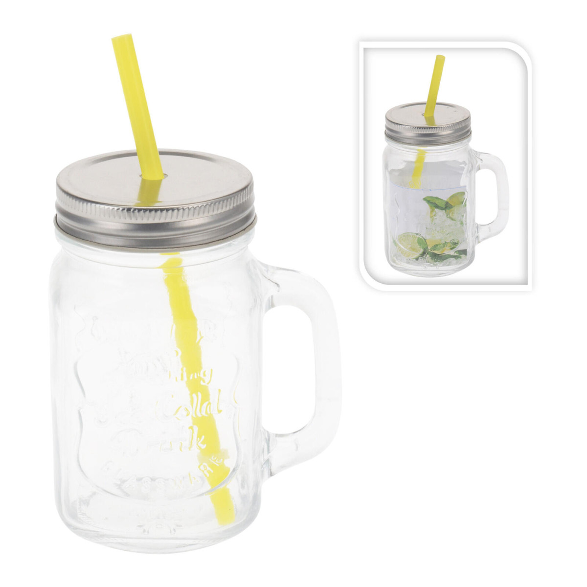 Sklenice 450 ml, s uchem, víčkem a brčkem. objem: 450 ml délka brčka: 23 cm materiál: sklo, kovové víčko, polypropylenové brčko barva brčka: žlutá Sklenice Vintage s víčkem a brčkem. Je ideální na limonády na piknik, grilování s přáteli nebo na dětskou párty. Sklenice má praktické víčko, které zabrání rozlití tekutiny a rovněž ochrání nápoj před vosami. Šířka přepravní: 7,5 cm Výška přepravní: 23,5 cm Hloubka přepravní: 10 cm Objem přepravní: 1,7625 dm3 Hmotnost přepravní: 0,337 kg Pozor křehké: Ano