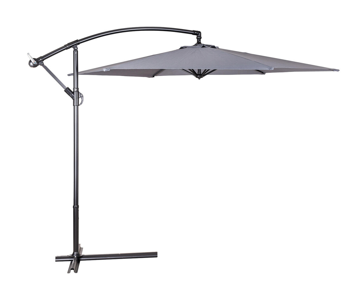 Závěsný slunečník průměr 300 cm má 6 ocelových žeber 12 x 18 mm, je vyrobený z polyesteru 160 g / m2. Pevná ocelová tyč má průměr 4,8 cm. Stojan, který je součástí výrobku je možno zatížit betonovými dlaždicemi pro zvýšení celkové stability. Otevírání slunečníku se provádí kličkou. Navíjecí systém má plastové pouzdro s kovovým navíjecím mechanismem - kovová klička, kovová hřídel a kovový pastorek s kovovou závlačkou. Barva šedá. Výška přepravní: 15 cm Šířka přepravní: 31 cm Hloubka přepravní: 196 cm Objem přepravní: 91,14 dm3 Hmotnost přepravní: 10,194 kg Pozor křehké: