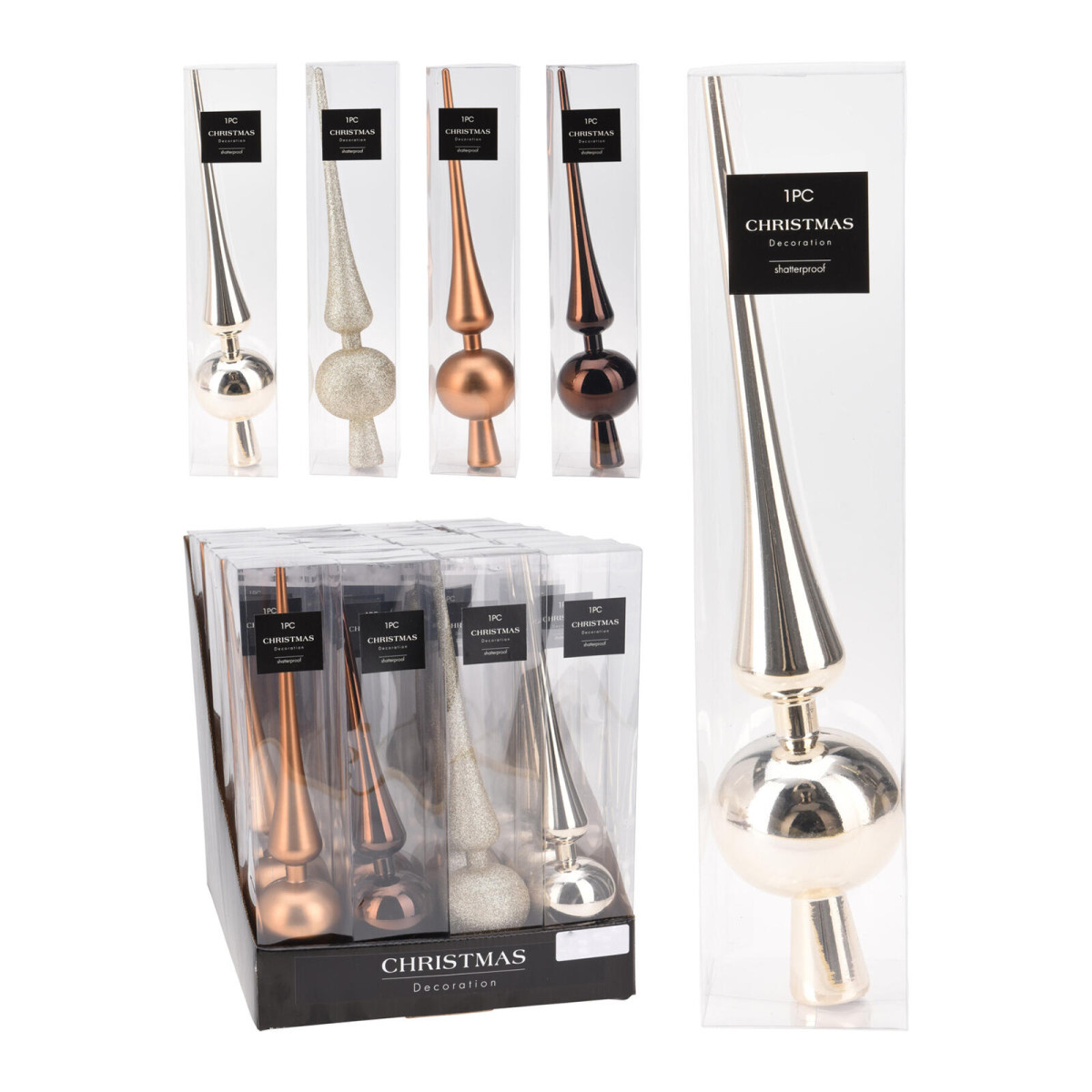 Špička na stromek 29 cm, HN, ZLA, mix. výška: 29 cm mix barev: měděná lesklá, měděná matná, zlatá lesklá, zlatá matná Ozdobná špička nesmí chybět na žádném vánočním stromku. Šířka přepravní: 6 cm Výška přepravní: 28,5 cm Hloubka přepravní: 6 cm Objem přepravní: 1,026 dm3 Hmotnost přepravní: 0,022 kg Pozor křehké: