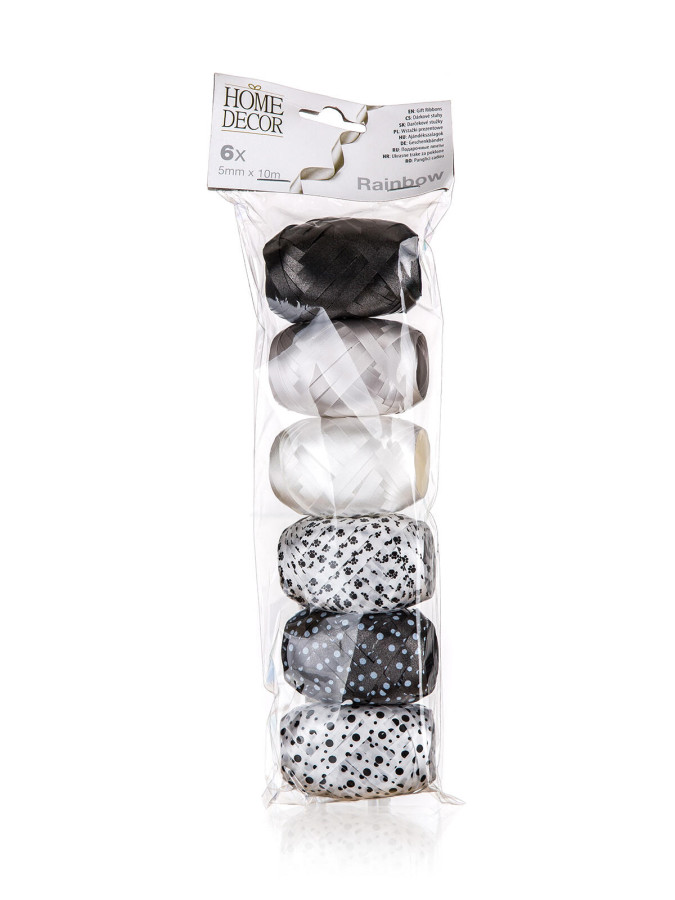 Sada vázacích stuh RAINBOW krásně ozdobí váš dárek, stuha je vhodná pro zavázání dárkových balení, sáčků apod. Rozměry: délka stuhy 10 m, šířka 0,5 cm. Sada obsahuje 6 ks. Výška přepravní: 3 cm Šířka přepravní: 7 cm Hloubka přepravní: 29 cm Objem přepravní: 0,609 dm3 Hmotnost přepravní: kg Pozor křehké: