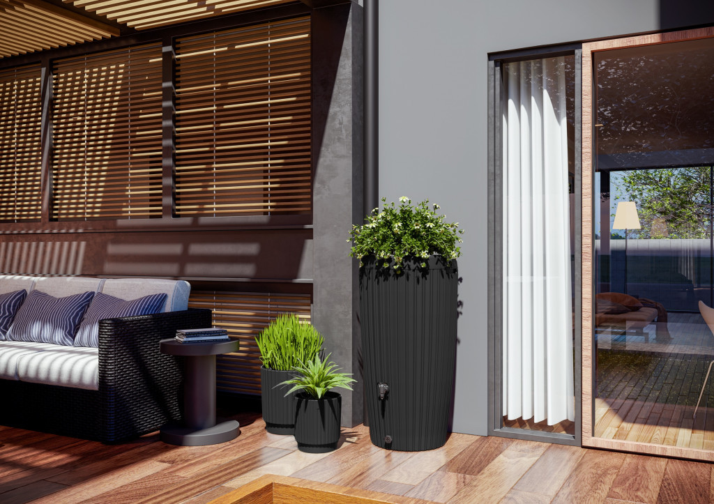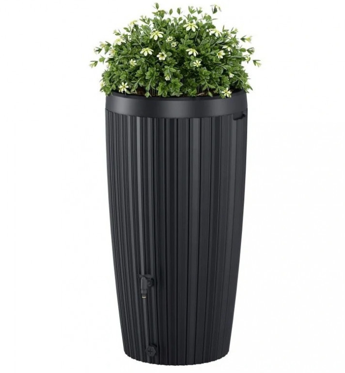 Stylový sud na dešťovou vodu, vyroben z kvalitního, odolného polyetylénu. Sud obsahuje víko, do kterého lze umístit květináče.