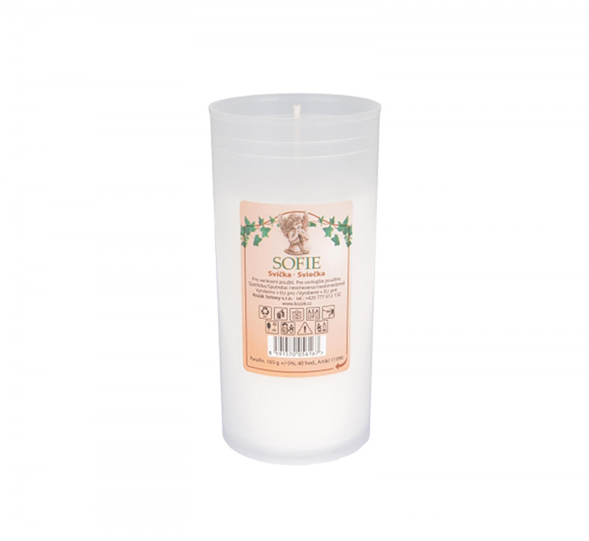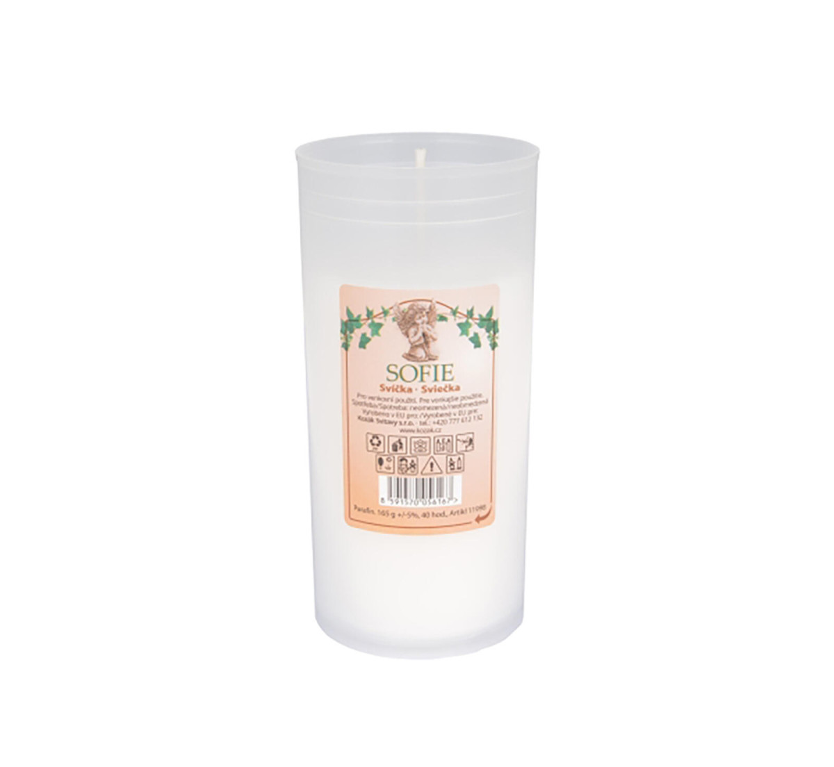 Svíčka hřbitovní náhradní 12 cm, 150 g (hoří 45 hod) parafínová BÍ. výška: 12 cm hmotnost: 150 g doba hoření: 45 hod parafín barva: bílá Parafínová hřbitovní svíčka, s náplní 150 g lisovaného parafínu, je vyrobená z kvalitního parafínu a díky použití speciálního knotu zajišťuje dokonalé vyhoření náplně bez zakouření skla. Barva plastového kelímku je bílá. Doporučujeme používat pouze jako náhradní náplň k hřbitovním sklům. Doba hoření svíčky je cca 45 hod. Doba hoření je závislá na okolní teplotě a povětrnostních podmínkách. Svíčku zapalujte pouze na nehořlavé podložce a je určená pro venkovní použití. Výška přepravní: 12 cm Šířka přepravní: 5,5 cm Hloubka přepravní: 5,5 cm Objem přepravní: 0,363 dm3 Hmotnost přepravní: 0,165 kg Pozor křehké: